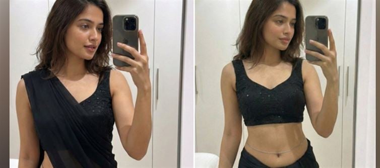 "saree": "black draped saree with soft fabric folds and realistic fabric physics",