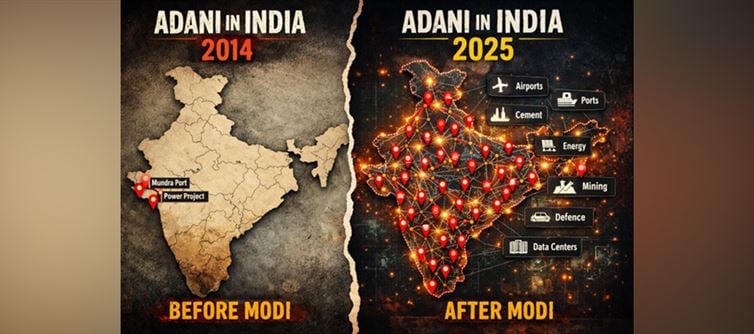 Sometimes, one image says what a thousand debates cannot. A viral post on X has ignited a political and economic firestorm by placing two maps side by side—India in 2014 and india in 2025—through the lens of the Adani Group. What was once a sparse cluster of red dots hugging the western coastline has transformed into a dense national web stretching across ports, airports, power plants, mines, cement units, defense corridors, and data centers. The caption was brutal, the implication sharper: “It is like the whole of india was handed over post-2014.” And just like that, a decade of growth was put on trial—by a map.