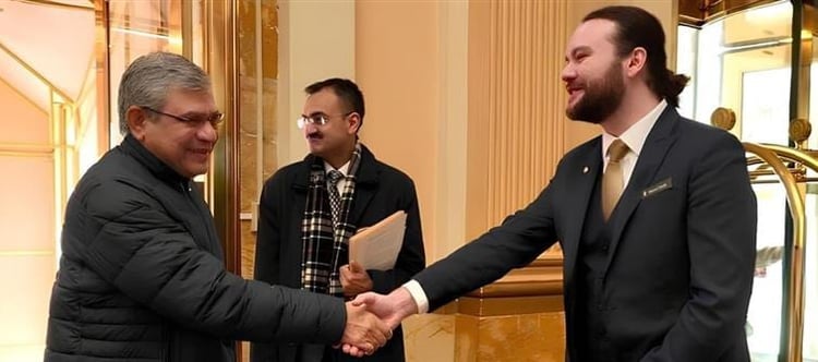 Spotting a well-dressed, good-looking bellboy, the political instinct kicks in. A handshake is extended—not out of courtesy, but calculation. The cameraman is alerted. The moment is framed. Click.