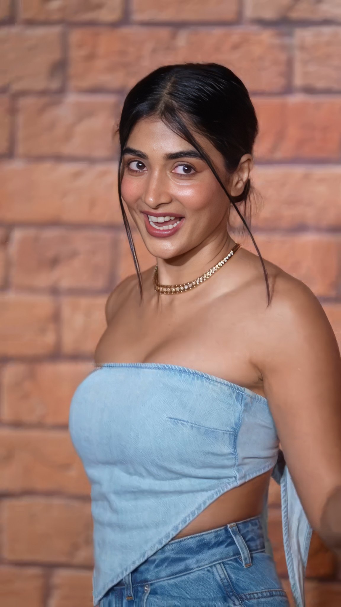 Pooja’s strapless denim bandana top is a straight throwback to early-2000s pop-girl energy—but refined. The straight neckline keeps it clean and elegant, while the snug fit anchors the look with confidence. It’s minimalist, yes—but make no mistake, this is a power move.