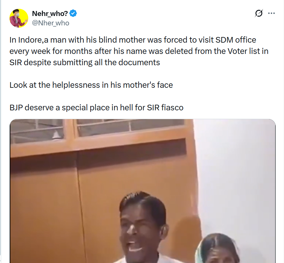 Democracy doesn’t collapse with tanks on the streets. It collapses quietly—in corridors, counters, and weekly office visits. In Indore, a man with his blind mother was forced to visit the SDM office every single week for months—not for a benefit, not for charity, but to restore his basic right to vote. His crime? His name vanished from the voter list during SIR—despite submitting all required documents. The helplessness on his mother’s face says what government press notes never will.