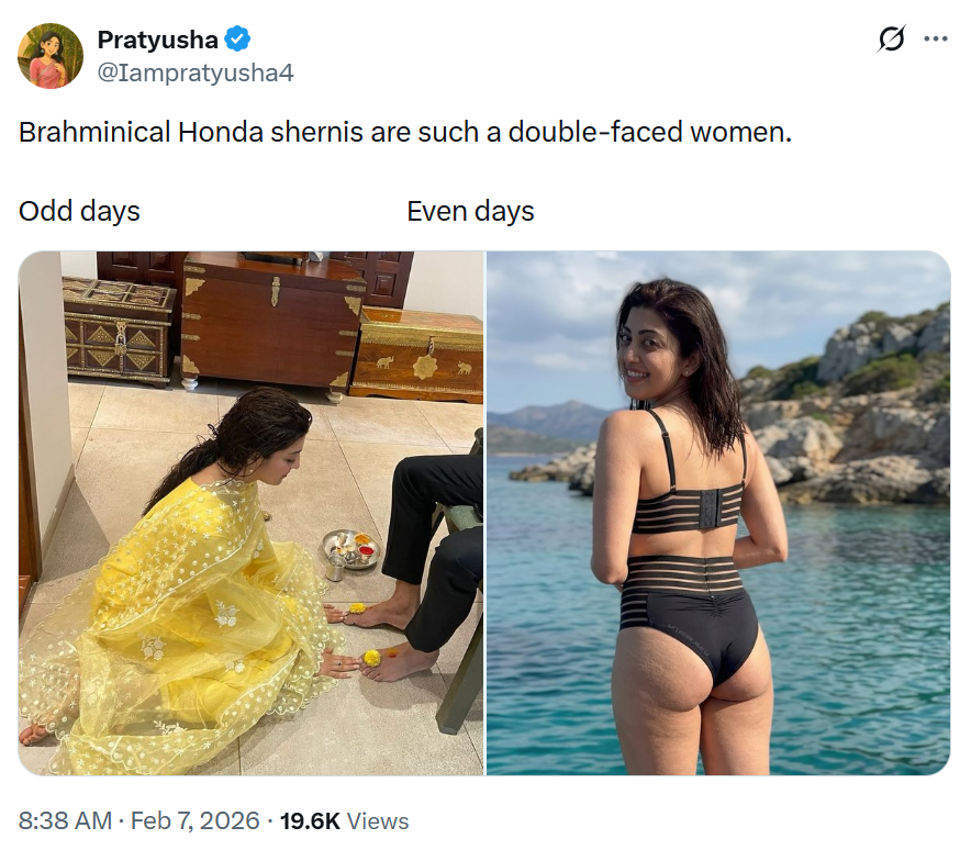 Pranitha Subhash, the self-styled “Sanatani feminist” who loves to lecture on blending eternal Hindu values with modern empowerment, just got brutally exposed by her own instagram feed. One day, she’s serving scorching bikini looks on a luxury vacation, owning her body and sexuality like the liberated woman she claims to be. Next, she’s publicly touching her husband’s feet in traditional ritual submission — the ultimate symbol of patriarchal devotion. Netizens didn’t hold back, flooding both posts with savage takedowns: “Brahminical Hindutva shernis are such double-faced women.” The backlash is relentless and deserved. You cannot cherry-pick feminism when it suits your brand while cosplaying a submissive sanskari bahu for cultural clout. This isn’t empowerment; it’s calculated hypocrisy wrapped in designer swimwear and ritual theatrics. Pranitha wanted to be both the bold modern icon and the perfect traditional wife — and ended up becoming the internet’s favourite example of performative contradiction. Bikini photos for progressive points — Pranitha confidently posts swimsuit pictures, knowing it will earn her “body positive” and “modern woman” praise from urban liberals. But the moment tradition is questioned, she pulls the “Sanatani” card to silence critics. Feet-touching ritual for conservative clout — Publicly performing the age-old gesture of touching husband’s feet isn’t personal devotion; it’s deliberate signalling to the Hindutva crowd that she’s still a “good Bharatiya nari” despite the Westernised glamour. “Sanatani feminist” is an oxymoron when convenient — She invented the label to enjoy feminist credibility without actually challenging patriarchal rituals. Real feminists don’t selectively uphold symbols of male superiority for likes. Netizens saw through the performance instantly — Comments like “Brahminical Hindutva shernis are such double-faced women” went viral because people are tired of celebrities preaching tradition to others while living privileged, contradictory lives. You can’t weaponise feminism and tradition simultaneously — Posting bold photos to assert autonomy, then performing ritual submission to signal virtue — that’s not balance, that’s brand management at its most cynical. This is peak privileged hypocrisy — Upper-caste, wealthy actresses like Pranitha face zero real consequences for either choice. They get applause from both sides while actual women suffer under the traditions they romanticise. The internet doesn’t forget juxtaposition — Side-by-side screenshots of bikini confidence and feet-touching devotion became instant meme material. The contrast was too glaring to defend. “Sanatani feminism” only works for instagram aesthetics — It allows her to collect validation from progressive followers and conservative protectors without ever taking a real stand on women’s rights or patriarchal customs. Other Hindutva-adjacent celebs do the exact same script — Bold photos for attention, traditional rituals for cultural legitimacy — it’s a tired playbook that netizens are finally calling out without mercy. The backlash is a wake-up call — Either own your modernity without the performative tradition , or embrace tradition without hijacking feminism. You can’t ride both waves forever. Pranitha’s double game just crashed spectacularly — and honestly, the internet’s ruthless honesty is the only thing holding these contradictions accountable.