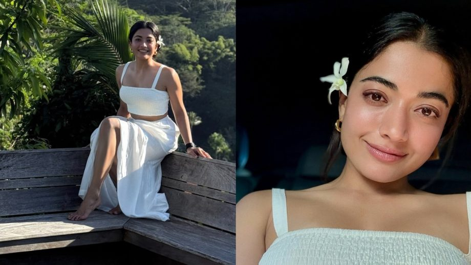 rashmika leaned into natural charm with a white crop top paired with a flowy skirt.