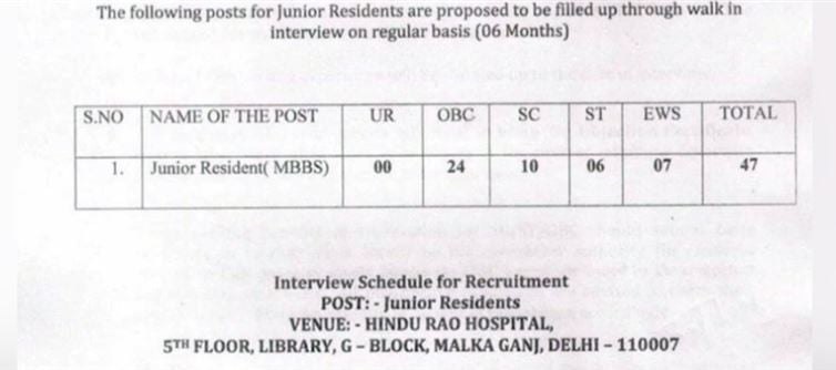 A recruitment notification from Hindu Rao Hospital in delhi has sparked intense debate across social media and policy circles. The hospital announced 47 vacancies for junior Resident (MBBS) posts, with zero seats allocated to the General category.