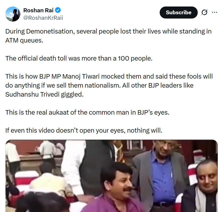 Leaders around Tiwari howl with laughter – no shame as misery unfolds nationwide. This pack mentality screams elite disconnect: Common man's aukaat? Disposable pawns for Modi's narcissistic "masterstroke." - Ego Over Experts: