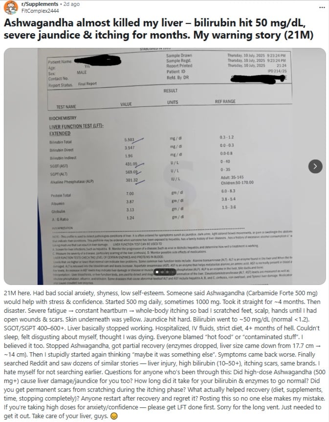 Real patients, real devastation: the biggest documented series (from leading hepatologists) showed Ashwagandha alone caused severe liver injury — no adulteration, no contamination excuses. In vulnerable people with existing liver issues, it pushed them over the edge into full-blown failure and death.