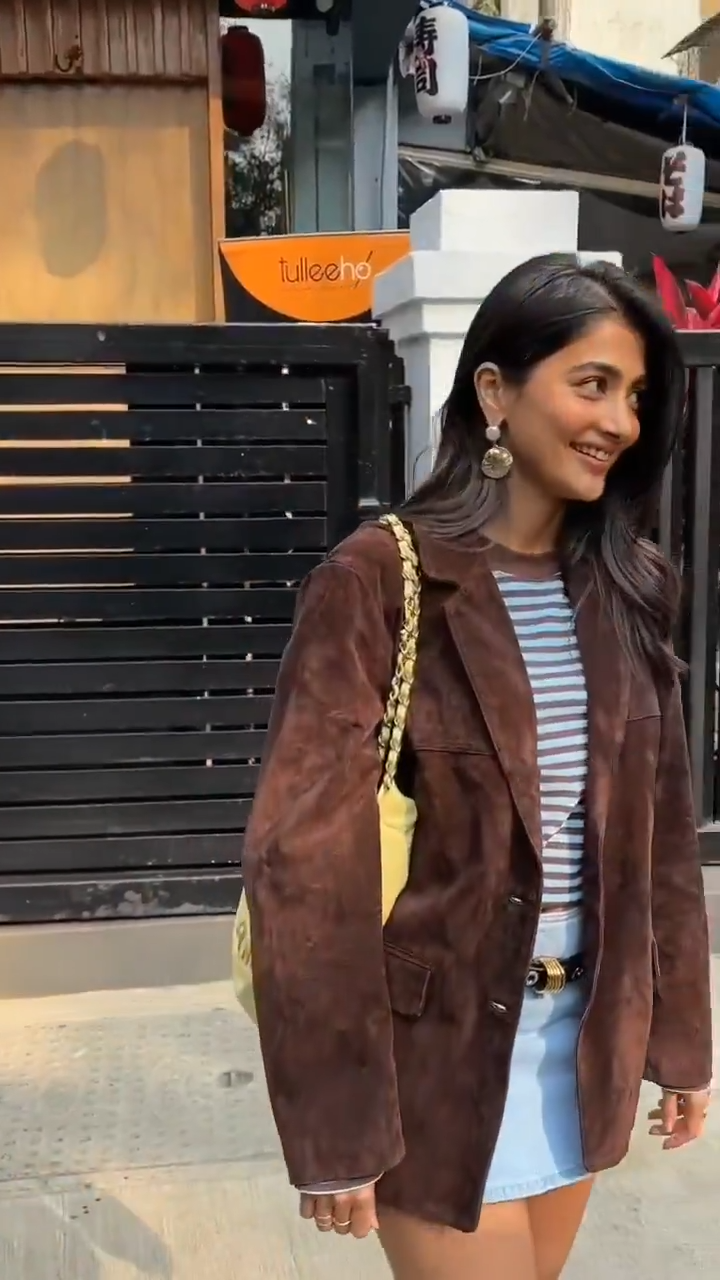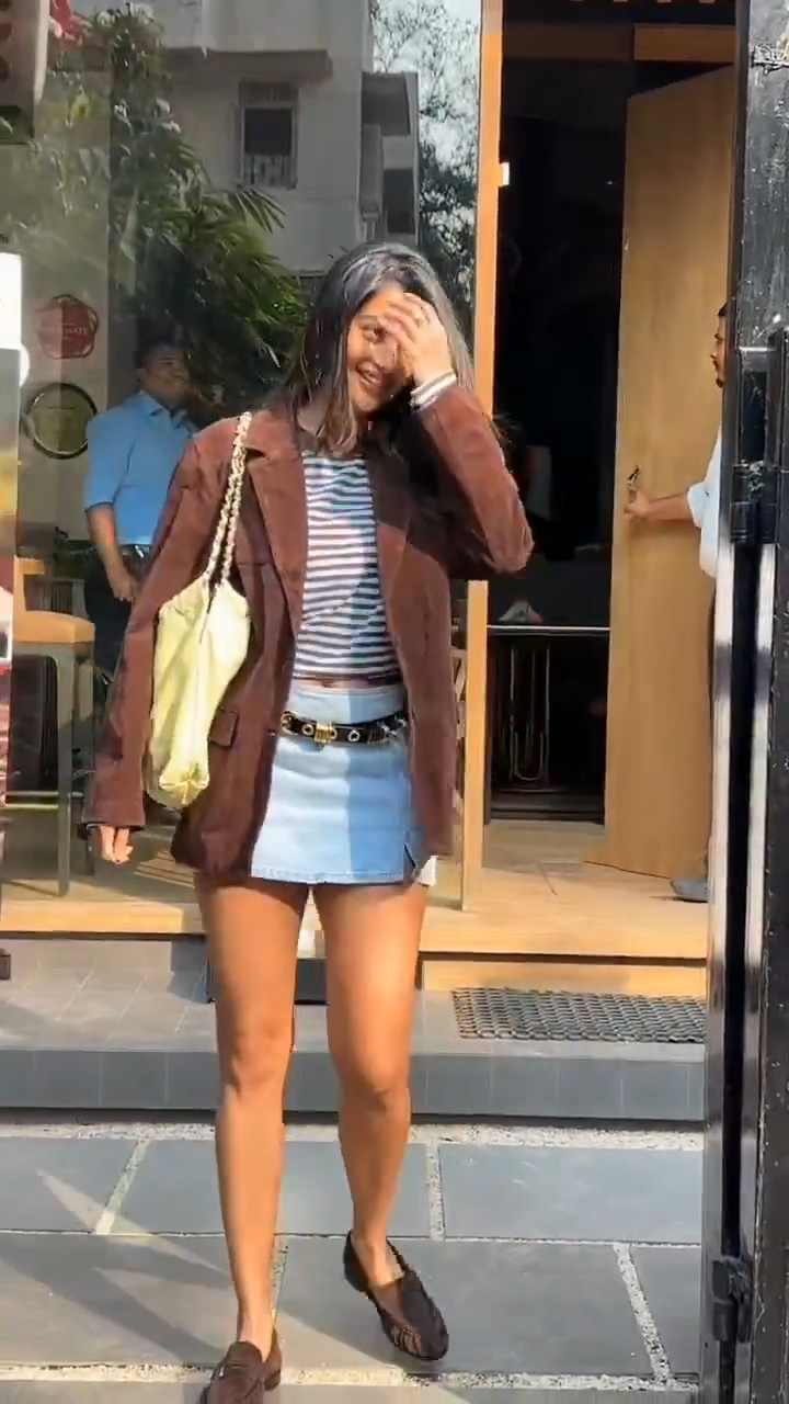 mumbai cool-girl energy in a perfectly layered casual ensemble. The star of the outfit was an oversized chocolate-brown suede blazer – plush, slightly slouchy, with a relaxed fit that added instant sophistication while keeping things laid-back. Underneath, she wore a classic blue-and-white striped crop top that flashed just a hint of midriff, bringing preppy nautical vibes to the look.