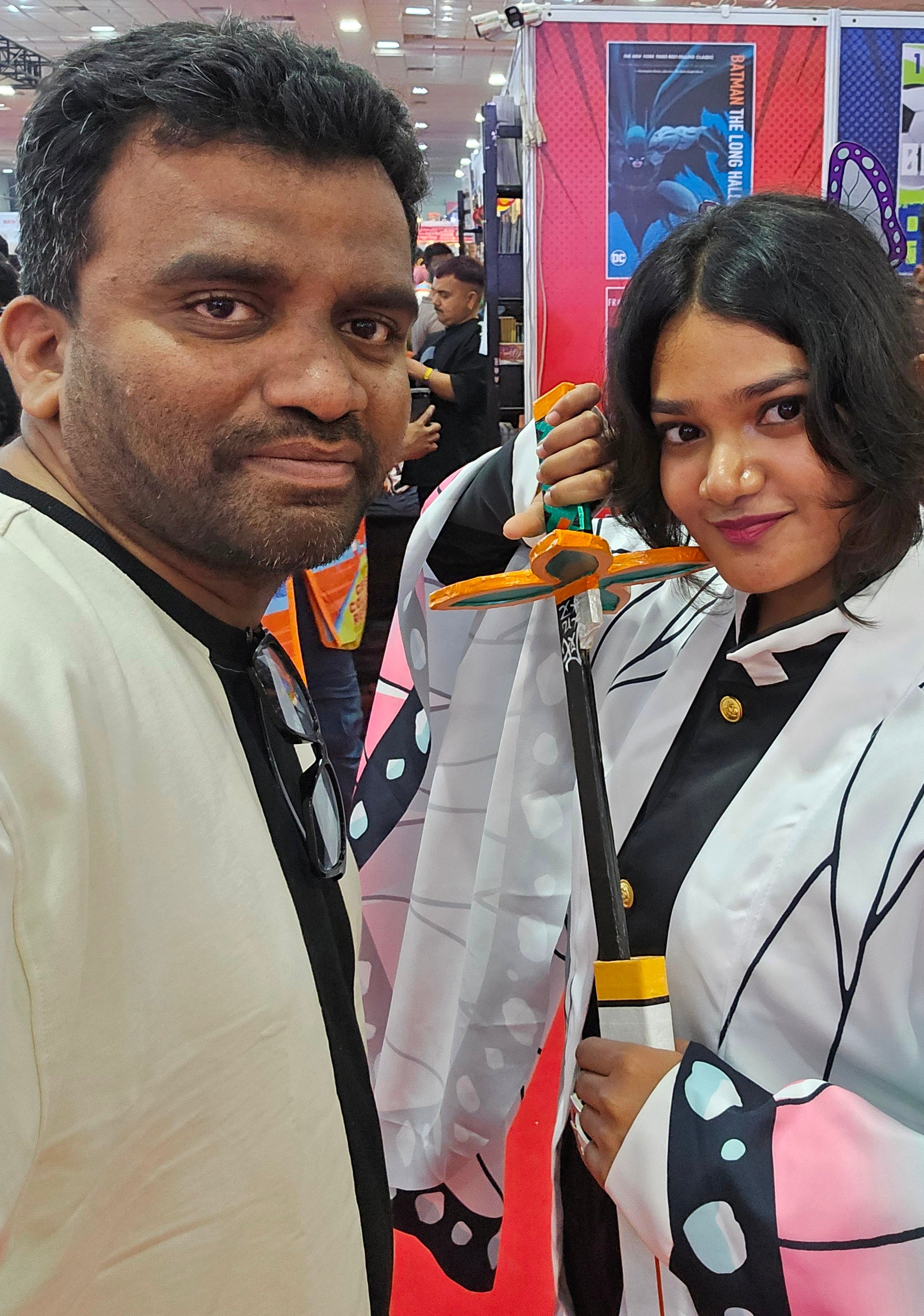 Bhavya, whom he had met at last year’s Comic Con, surprised him this time by arriving dressed as Shinobu Kocho from Demon Slayer: Kimetsu no Yaiba. The detailing on her outfit — from the butterfly-patterned haori to the delicate colour work — was carefully done and beautifully presented.