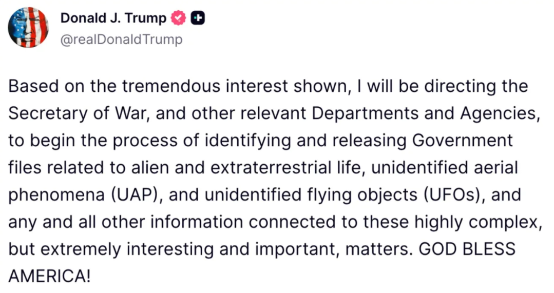 In a fiery Truth Social post, Donald Trump announced that he plans to direct top administration officials to begin identifying and releasing government files tied to UFOs, unidentified aerial phenomena (UAP), and even extraterrestrial life.