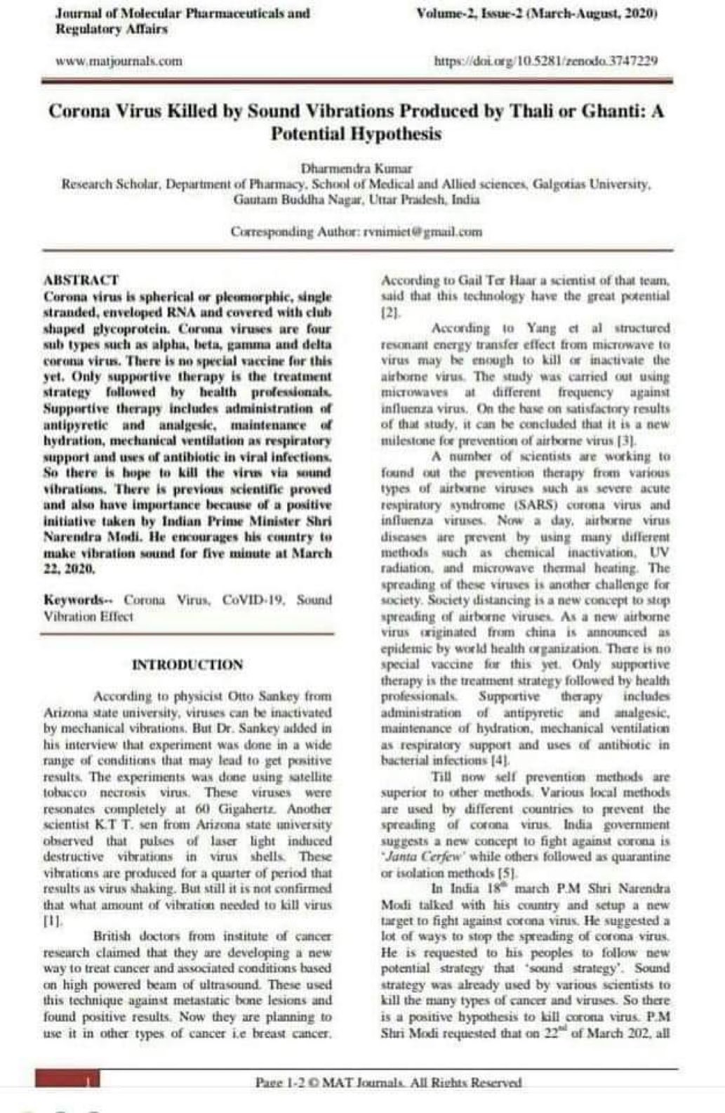 Riding the wave, dharmendra Kumar, a research scholar at Galgotias university, dropped a paper titled "Corona Virus Killed by Sound Vibrations Produced by Thali or Ghanti: A Potential Hypothesis." He seriously argued the clanging could disrupt the virus like microwaves. Pseudoscience dressed as research – and published in a shady journal.The Backlash and Humiliating Retraction