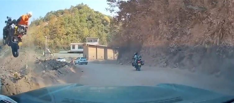 Captured on a following driver’s dashcam, the heart-stopping clip shows the rider sliding off the unguarded cliff in a cloud of dust, disappearing into the void like she was auditioning for a Fast & Furious sequel directed by Wile E. Coyote. Expectation: tragedy. Reality: she climbed back up, dusted herself off, and walked away without a single injury. Not a scratch, not a broken bone—nothing.