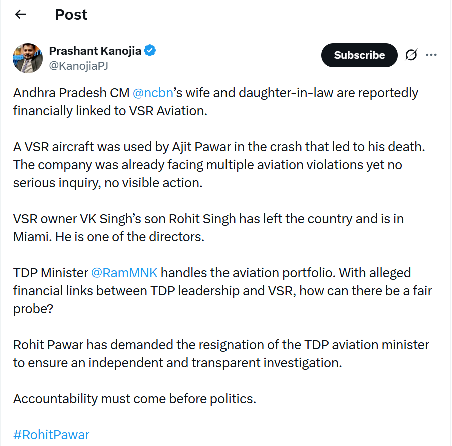 The spotlight is now firmly on VSR Aviation, a company reportedly facing multiple aviation compliance issues even before one of its aircraft was involved in the crash that led to the death of Ajit Pawar. While investigators must establish the technical facts behind the accident, the surrounding circumstances have sparked serious political and ethical questions that refuse to fade.