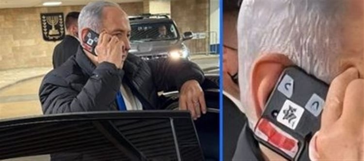 Benjamin Netanyahu is covering the camera lens on his phone.