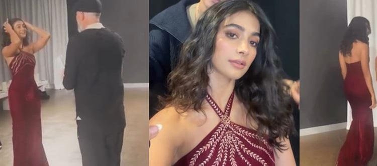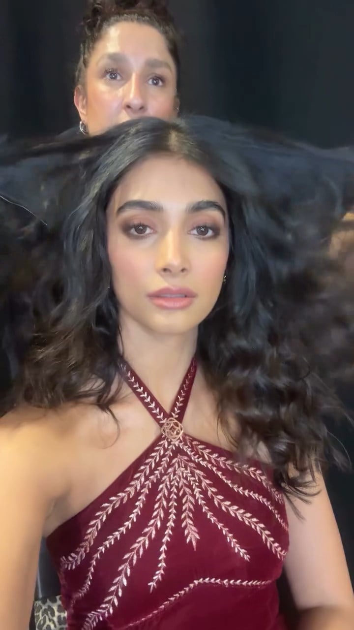In one steamy shot, Pooja's luscious dark waves are being teased to perfection by her stylist, her sultry smokey eyes and nude pout screaming "come hither" while she gazes into the camera with that signature smolder. It's pure backstage magic: the glow of her sun-kissed skin against the rich red fabric, a central brooch adding just the right touch of opulent bling.