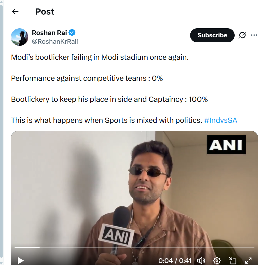 Just like Modi's inner circle of bootlickers who echo every policy without question to stay in power, Suryakumar's sucking up reeks of desperation. Against Pakistan, he might've talked a big game, but when it mattered yesterday against South Africa, his bat did the talking – or rather, the whimpering. politics in pads? It's not inspiring; it's embarrassing.