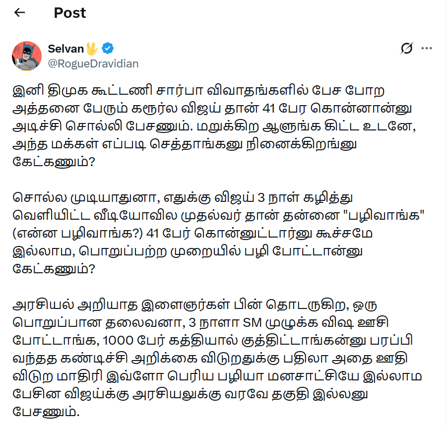 @RogueDravidian fires back in tamil and English, urging DMK allies to hammer Vijay in debates: "If Vijay has any shame, why blame the cm for killing 41?" The critic slams Vijay for not condemning false rumors of stabbings and poison, instead fanning flames three days later. Labeling him an "egomaniacal, inhuman, cruel, cowardly creature," the post warns he's like Trump—ready to trample "a zillion people" for self-preservation. With cult-like youth followers, granting him power could "endanger everyone" and the state's future.