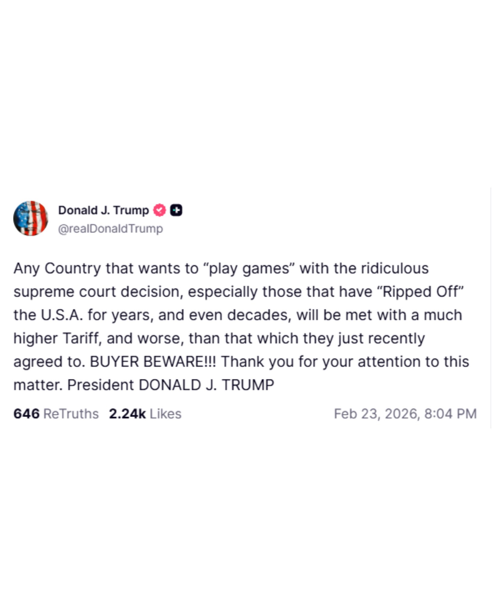'Buyer Beware' Goes Nuclear: Not one to back down, trump hit Truth Social on february 23, threatening countries that "rip off" the US or mess with the ruling. Higher tariffs? Check. "Worse" punishments? The suspense is killer—what does that even mean? It's classic Trump: lashing out when cornered, turning a legal loss into global intimidation.