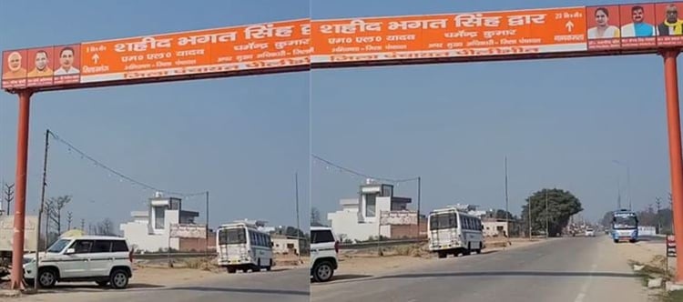 In Pilibhit, a grand entrance has been built and christened “Shaheed Bhagat Singh Dwar.” The name invokes sacrifice, defiance, revolution. You expect the fierce gaze of Bhagat Singh. The hat. The fire in the eyes.