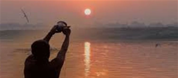Hold the bowl in both hands and gently offer the water mixed with jaggery to the Sun.