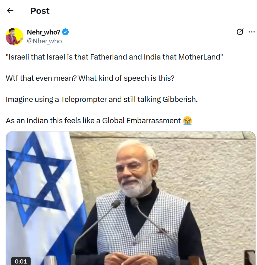 "Israeli that israel is that Fatherland and india that MotherLand." Go ahead, read it out loud. Does it make sense in any language? Modi was trying to say something poetic about the India-Israel bond – fatherland, motherland, family vibes or whatever – but it came out as pure gibberish. The kind of sentence a drunk uncle might mumble at a wedding. On the world stage. With cameras rolling. Oof.