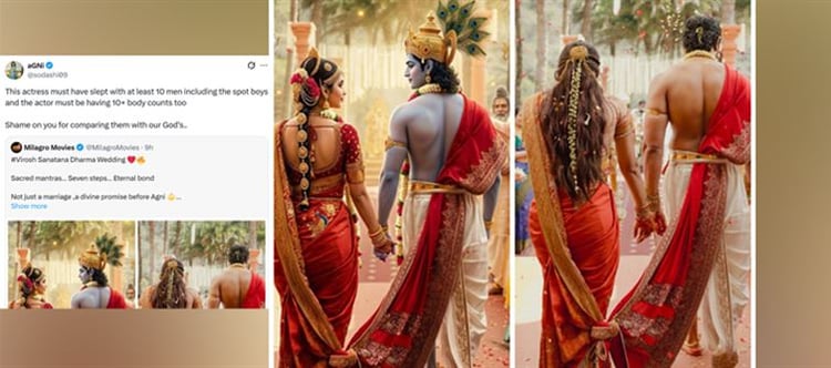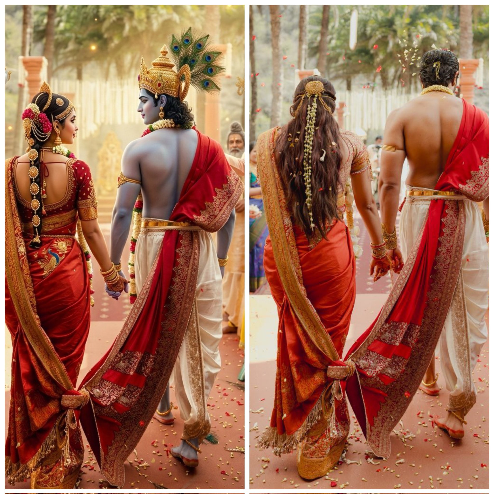 Two stunning AI images — left side: rashmika and Vijay facing each other, he looking every inch like Lord Rama/Krishna in ceremonial dhoti and crown; right side: back view, saree pallu tied, shirtless groom, flower petals raining down. It screamed eternal Sanatana love. 271k views, fans calling it “divine,” “Sita-Ram vibes,” “real Hindu wedding goals.” For five minutes, twitter was beautiful.2. Enter the Sewer-Minded Troll