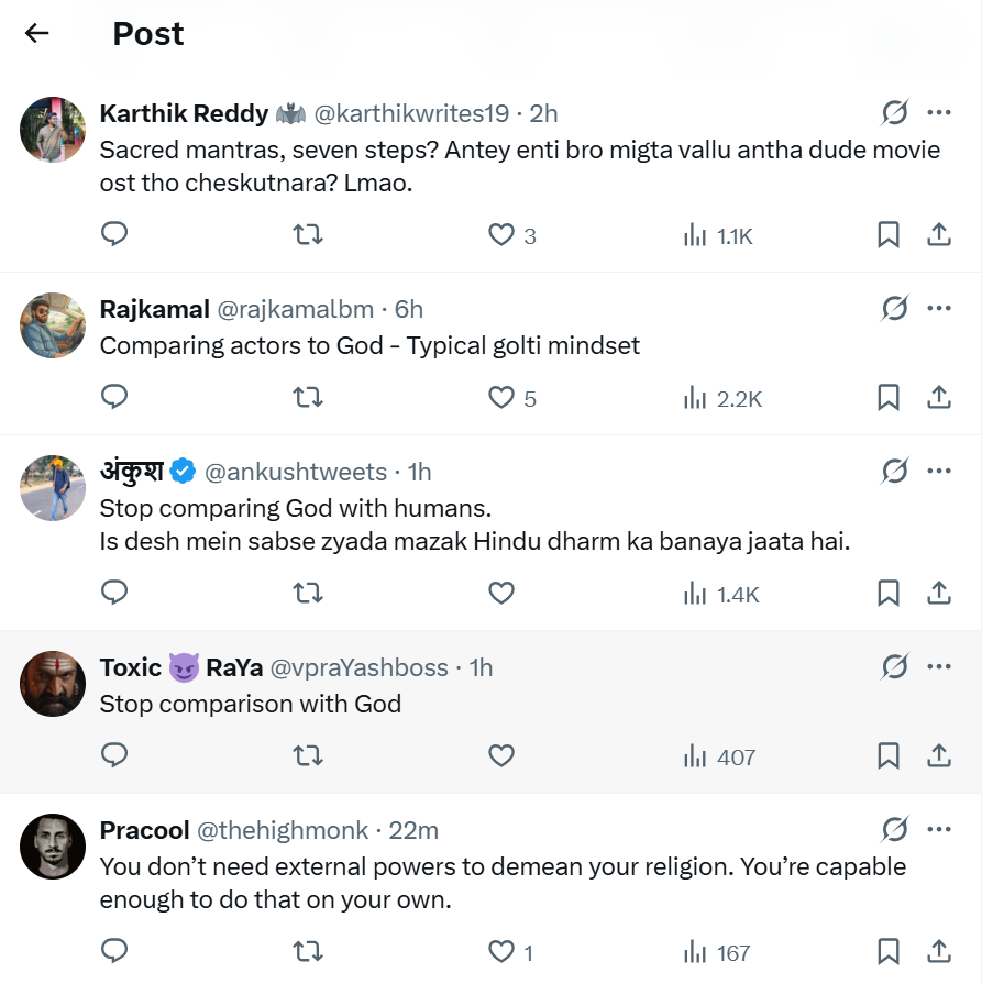 Replies didn’t just ratio him — they buried him alive. “Can’t you just be happy for them for one day?” “Define women by body count much?” “Think about your mother.” “Wow, congratulations on becoming the director of the FBI.” “Every woman is Devi incarnate.” One guy even said, “You don’t know anything about her personal life, and you assume things… Get help, please.” The post currently sits at 255k views with replies outnumbering likes 10-to-1. The block button got a workout.4. The Hypocrisy That Stings