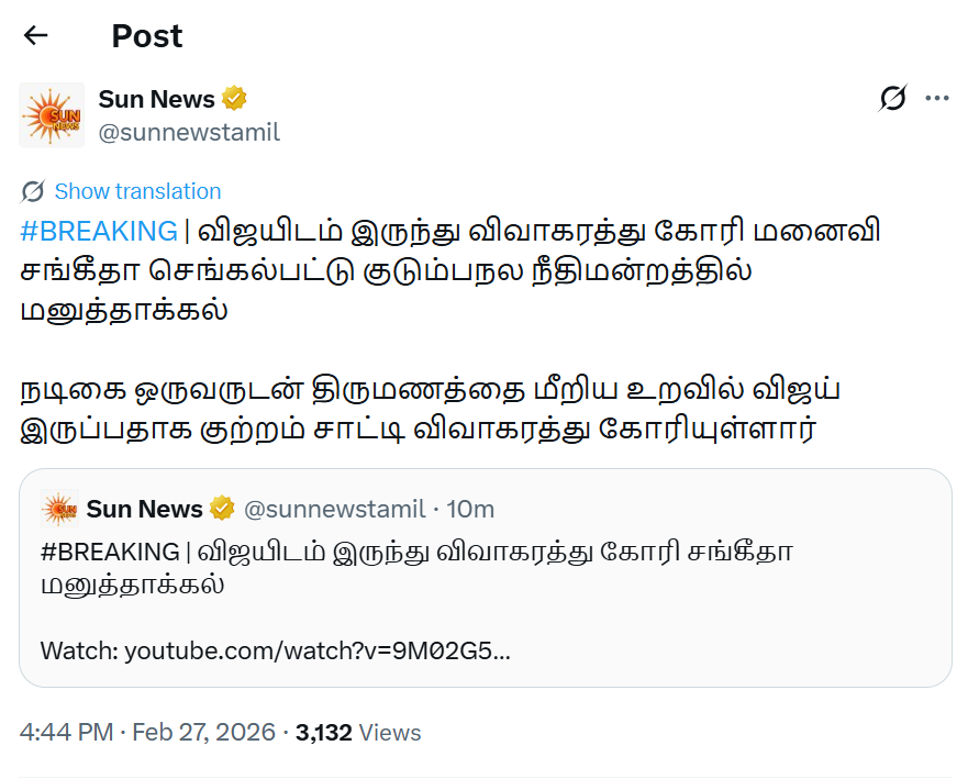 sangeetha has formally sought dissolution of marriage, citing serious allegations. According to reports, she has accused Vijay of being in a relationship outside the marriage with an actress.