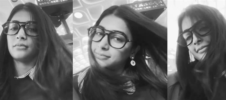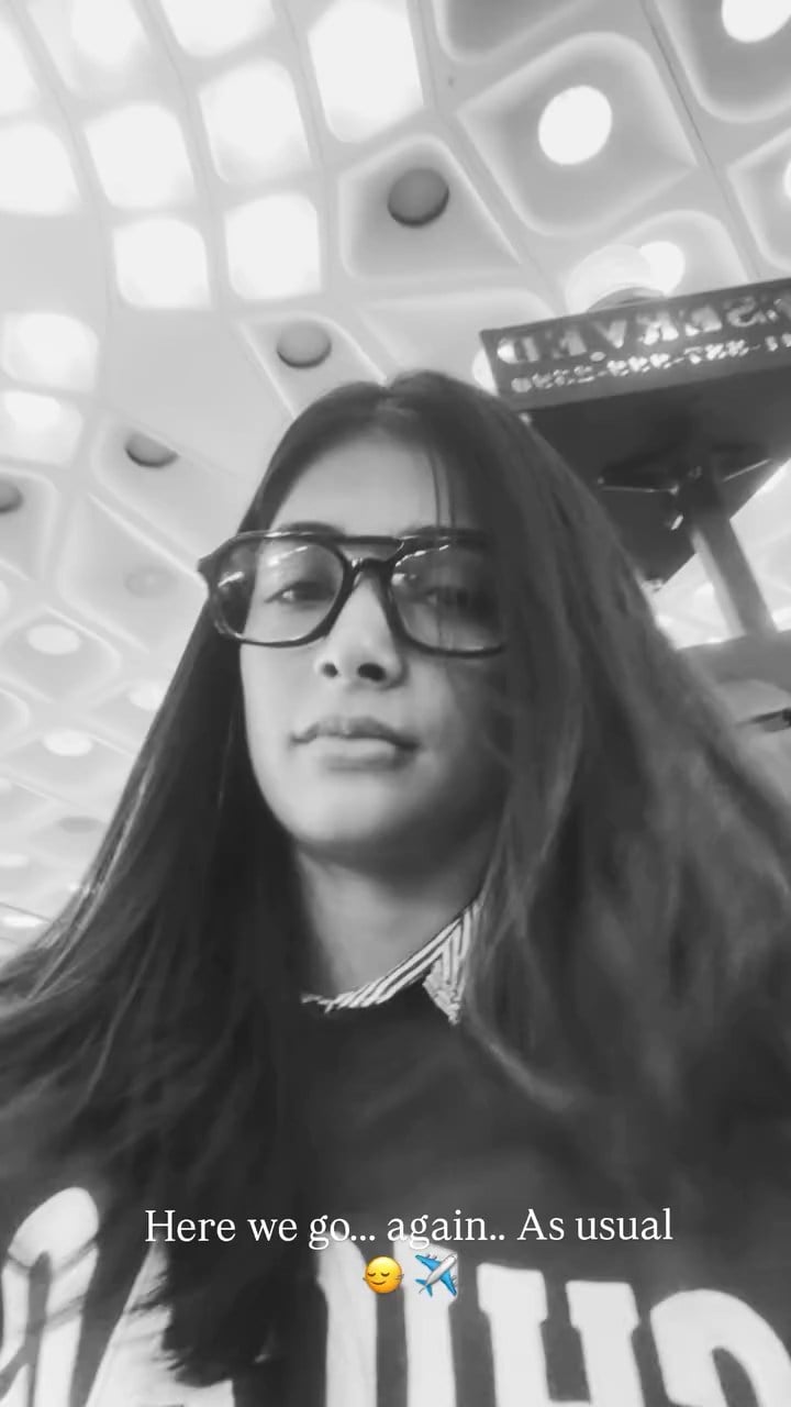 Pooja Hegde is back at it, turning a routine airport moment into straight-up glamour warfare. These three black-and-white snaps scream effortless hotness – she's rocking oversized chunky black glasses that frame her killer eyes perfectly, long wavy hair cascading down like she just stepped off a magazine cover, and that signature megawatt smile that's equal parts sweet and dangerously seductive. The backdrop? A futuristic airport ceiling with those hypnotic geometric patterns and glowing lights, making her look like she's floating in some high-fashion dream sequence.