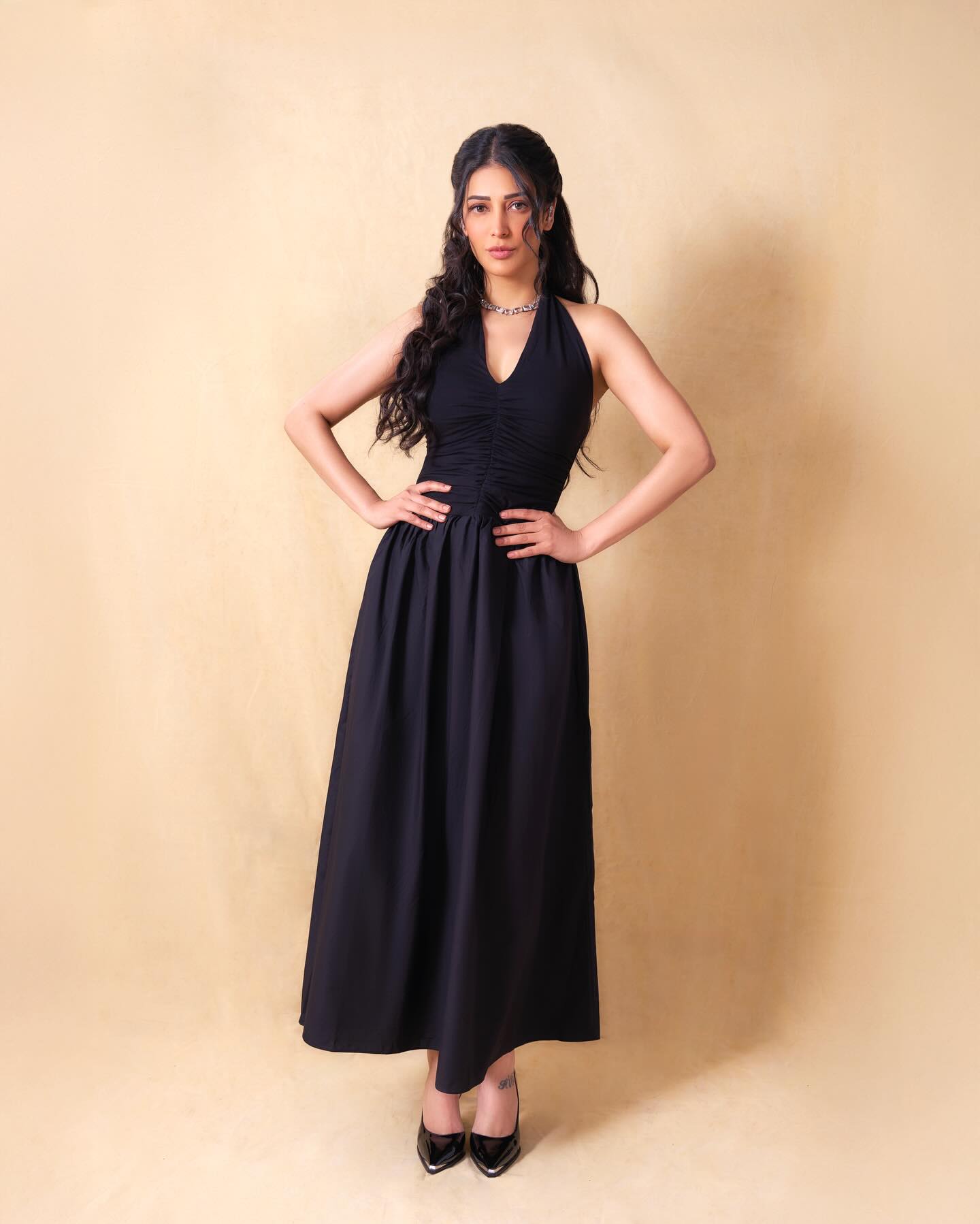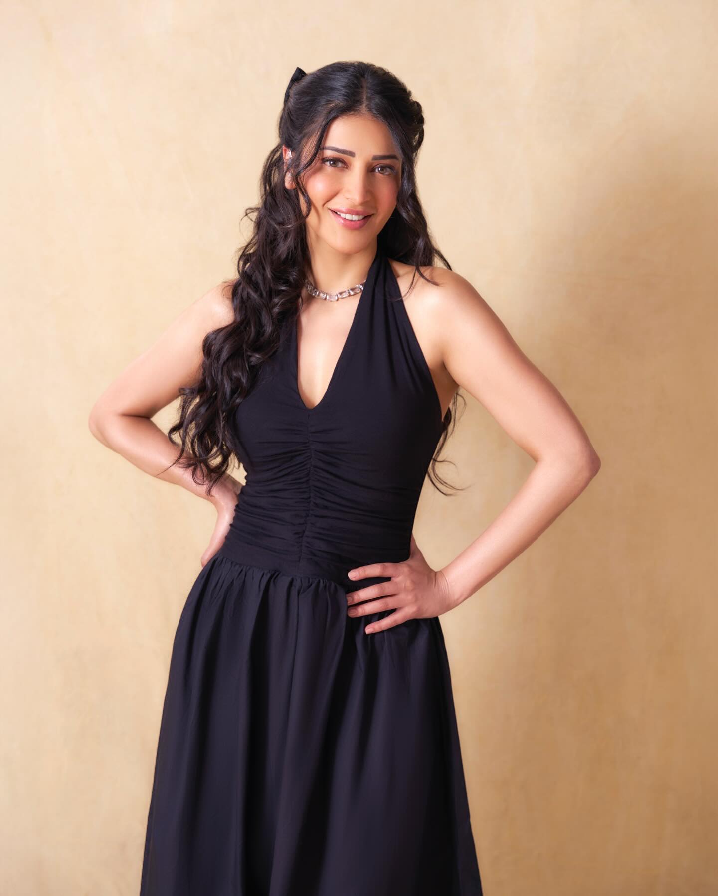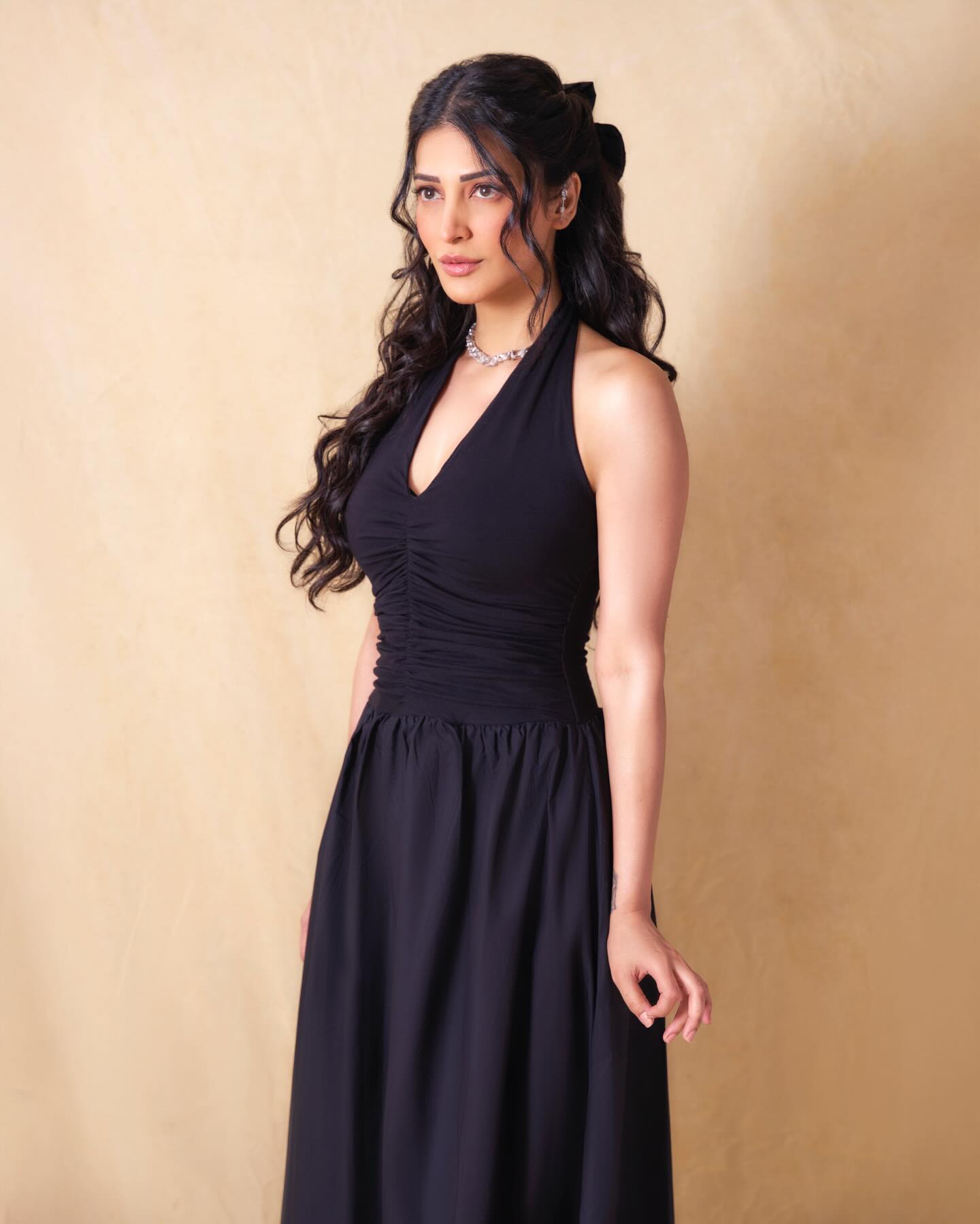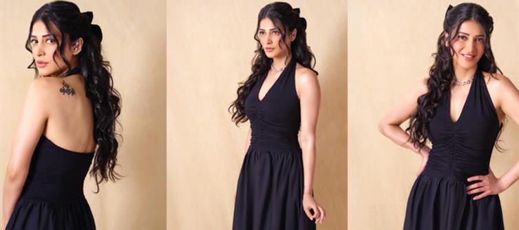 Black isn’t just a colour in Shruti’s wardrobe. It’s an attitude. The sleeveless halter-style dress hugged her silhouette at the top before flowing into a graceful full-length skirt. Clean lines. zero fuss. Maximum impact. The tailoring celebrated her frame without overpowering it — modern, minimal, and undeniably magnetic.