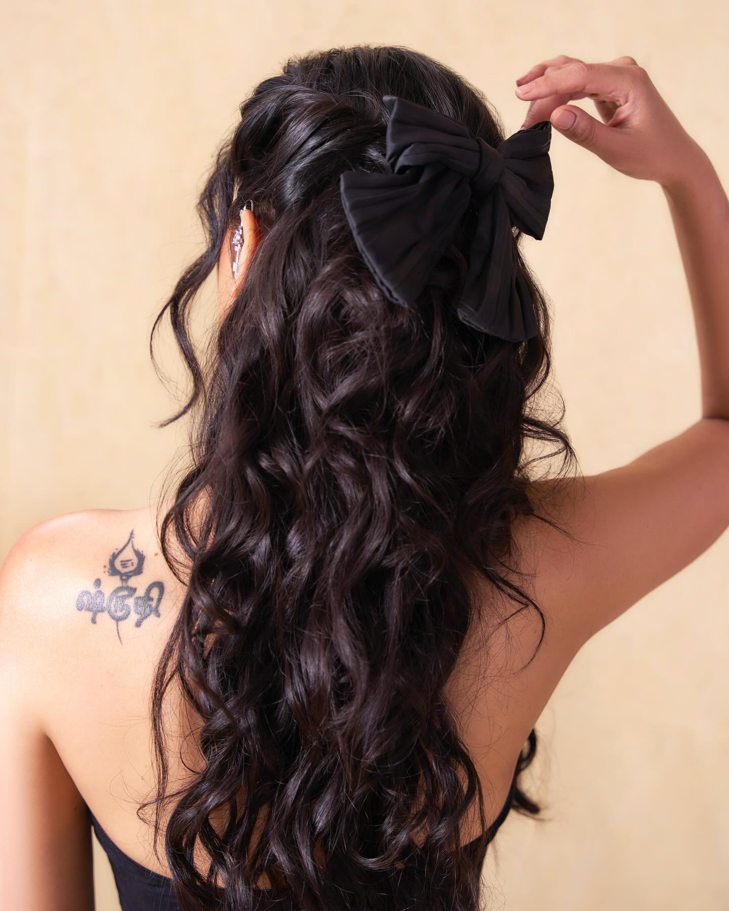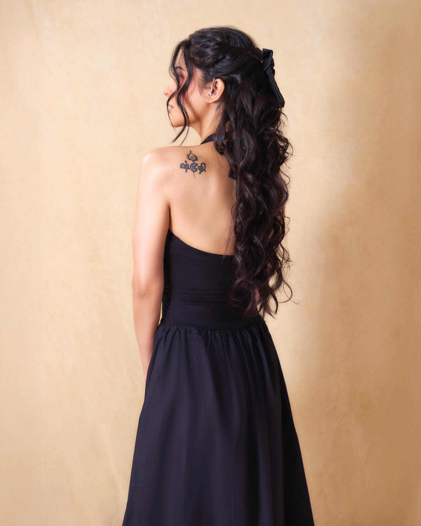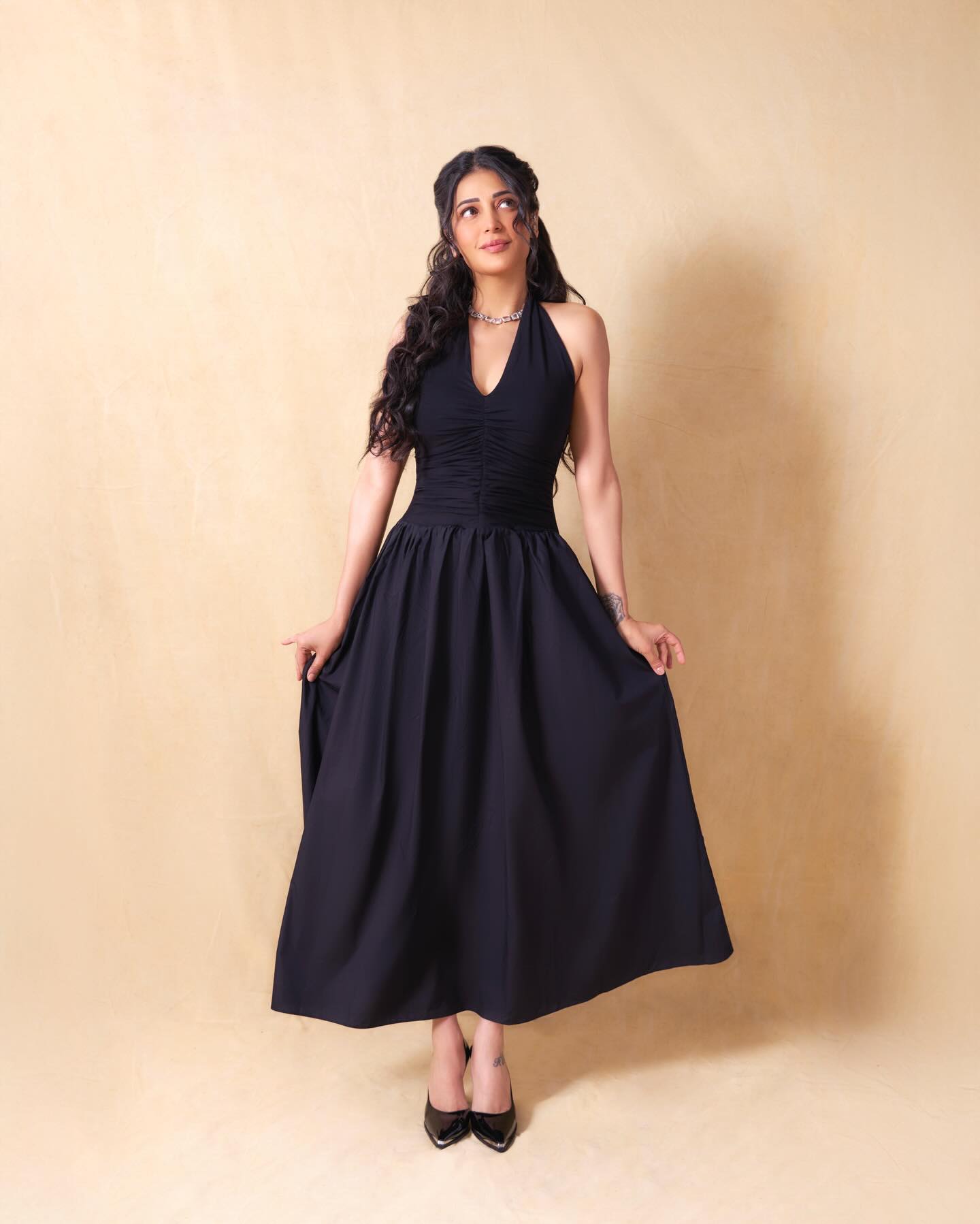 Black isn’t just a colour in Shruti’s wardrobe. It’s an attitude. The sleeveless halter-style dress hugged her silhouette at the top before flowing into a graceful full-length skirt. Clean lines. zero fuss. Maximum impact. The tailoring celebrated her frame without overpowering it — modern, minimal, and undeniably magnetic.