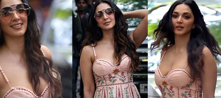 Kiara Advani is out here rewriting "effortless chic" in these scorching shots. Picture this: a soft peach-pink embroidered maxi dress hugging every curve, with delicate floral motifs blooming across the bodice and skirt like she wandered out of a summer dream. The spaghetti straps and structured bustier top create that perfect plunge, showing just enough to make hearts race, while the flowing pleated skirt sways with every step. Those oversized gold aviator sunglasses perched on her face add major cool-girl energy, reflecting blue bokeh lights and turning the whole vibe into golden-hour magic.