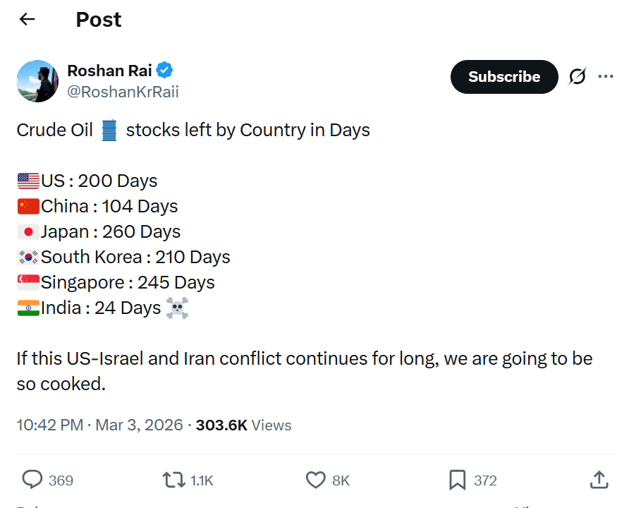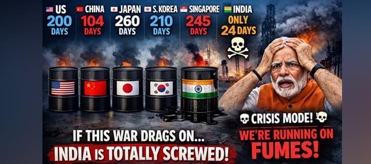 This is the kind of gut-punch reality check that should make every indian furious. While the world sits on mountains of crude oil reserves, Modi’s india is barely scraping by with a pathetic 24 days’ worth. Yes, you read that right. America has 200 days. japan 260. Even tiny singapore has 245. We? Just 24. And if this US-Israel-Iran mess drags on even a little longer, we’re completely cooked – skyrocketing fuel prices, crippling inflation, and daily life grinding to a halt for the common man.