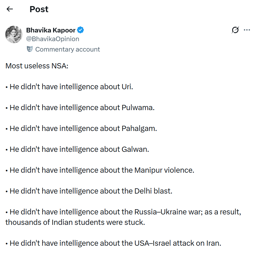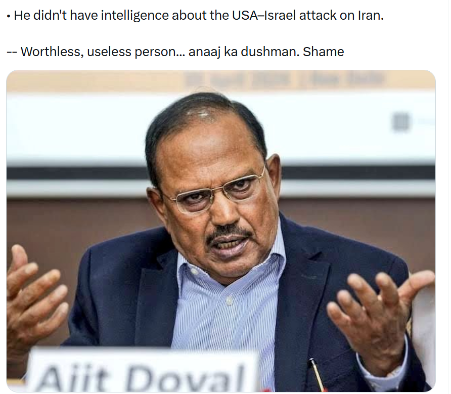 Zero intel on Uri. zero on Pulwama. zero on Pahalgam. zero on Galwan, where our soldiers were slaughtered. He didn’t see Manipur exploding into violence. Missed the delhi blast completely. Had no idea Russia would invade Ukraine, leaving thousands of indian students trapped and terrified. And now? zero clue about the USA-Israel strike on Iran. Oh, and don’t forget bangladesh – another crisis he somehow slept through.