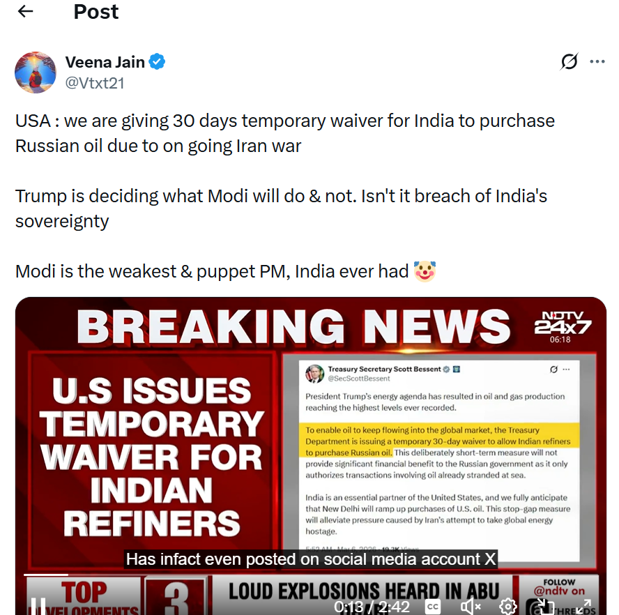 Amid the horror in Iran—death tolls skyrocketing and chaos everywhere—the US is using it as cover to tighten the screws on allies like India. Sure, the waiver sounds practical, but dig deeper: It's a power play to isolate russia while keeping india hooked on American goodwill. Modi's caught in the crossfire, looking more like a bystander than a boss. How long before this "temporary" fix turns into permanent puppetry?