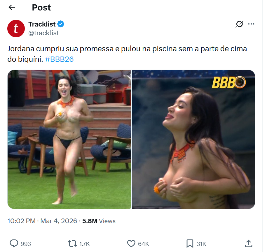 The Stunt That's Got Everyone Talking – And FacepalmingOkay, let's be real – Jordana just pulled off her wild promise on BBB26, diving into the pool without her bikini top, all laughs and zero regrets in the moment. It's that classic reality tv chaos, but fans are already buzzing about the fallout, especially with whispers of a fake elimination wall looming. Talk about timing – is this bold or just begging for airtime?