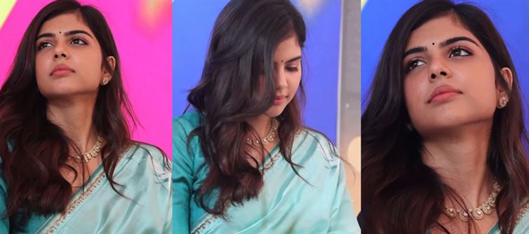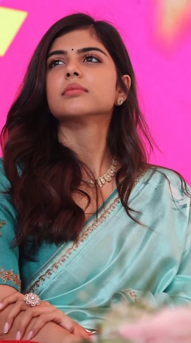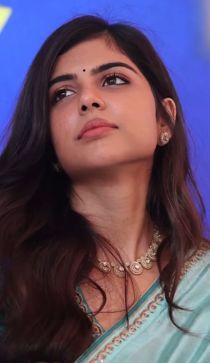 Kalyani priyadarshan captivates in these stunning captures, embodying the perfect fusion of traditional indian elegance and modern allure. Draped in a luxurious turquoise saree, the fabric appears to be a silky chiffon or georgette blend, shimmering under stage lights with a subtle sheen that accentuates her graceful silhouette.