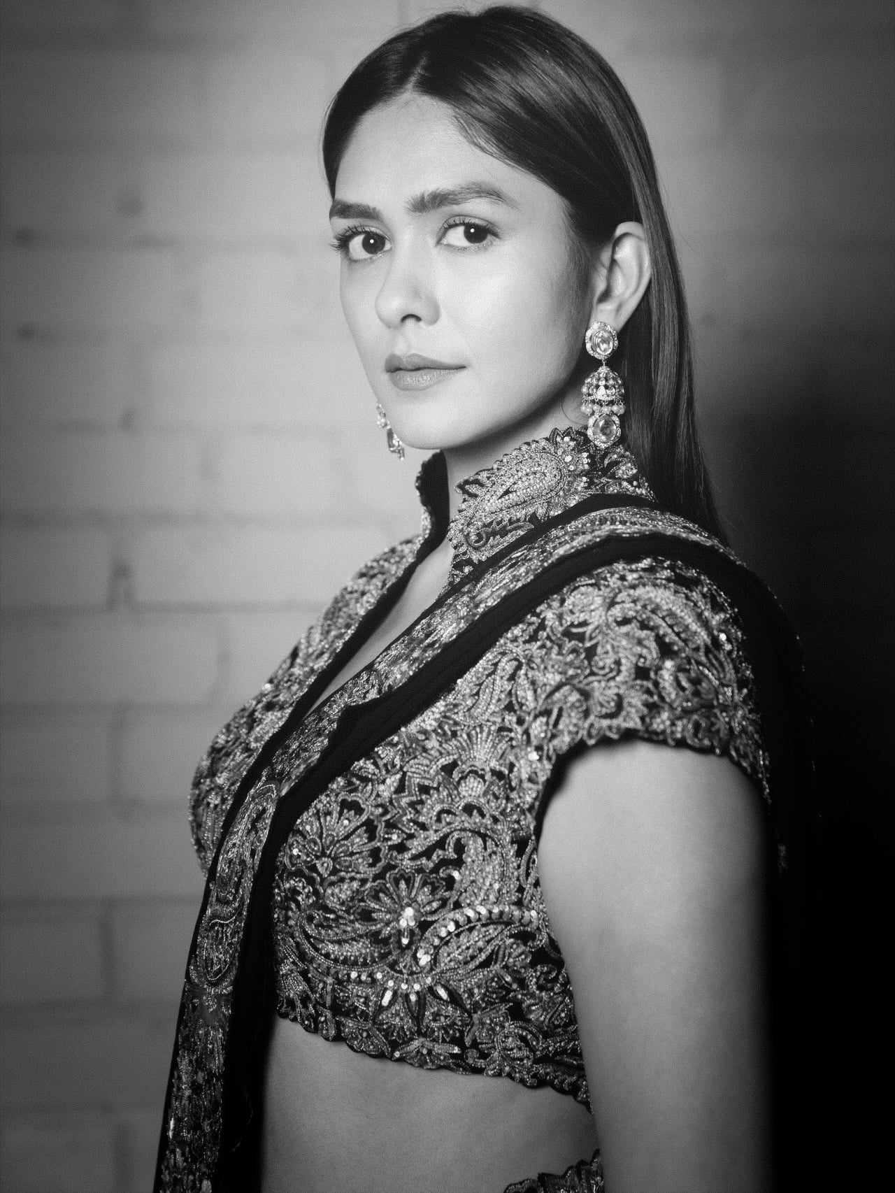 This ensemble screams high-fashion desi royalty—traditional embroidery meets contemporary cut, making Mrunal look like she stepped out of a couture dream. Undeniably stunning.