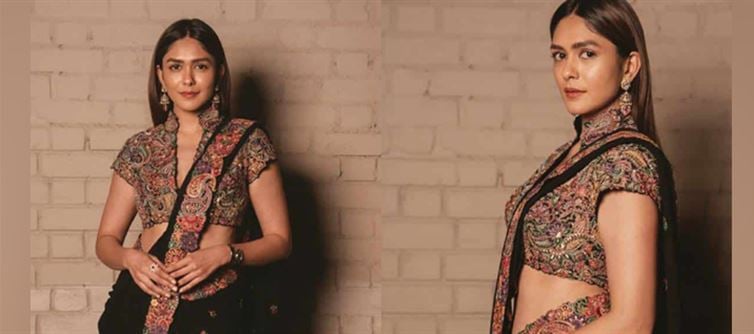 These breathtaking shots of Mrunal Thakur showcase her in an absolute ethnic masterpiece that's dripping with opulent craftsmanship and modern edge. The look is a black-based lehenga-choli combo elevated to goddess status: a heavily embroidered crop blouse exploding with multicolored paisley and floral zardozi work in vibrant reds, greens, purples, golds, and pinks, accented by pearls, sequins, and mirror details that catch light like fireworks.