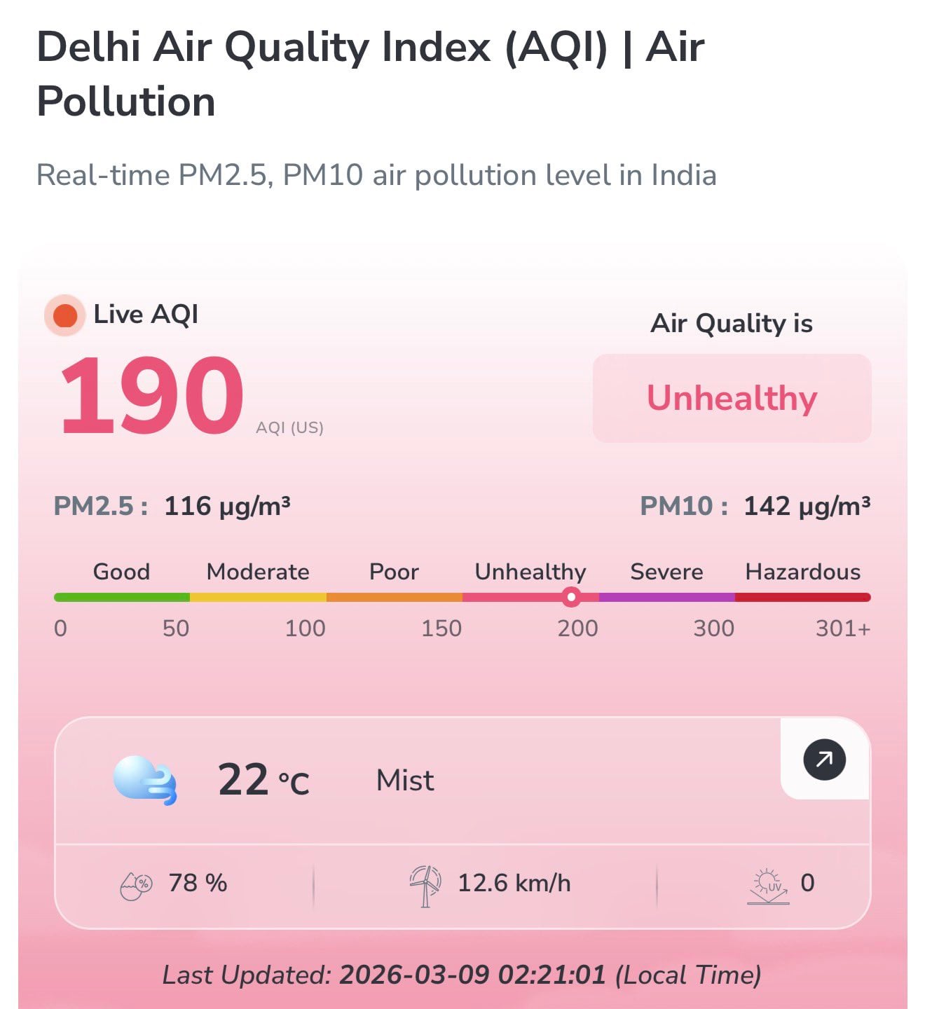 Tehran: Bombs drop, depots burn, black rain falls, residents gasp through hydrocarbon hell. AQI? Still “only” 82 amid the apocalypse. Delhi: zero sirens, just endless traffic, stubble burning, and construction dust. AQI 190 on a “peaceful” day – we’re inhaling what Tehran gets in wartime spikes, but every single morning. Who’s really under siege?