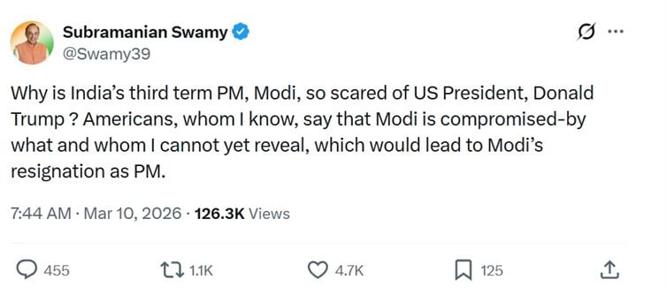In his tweet, Swamy asked a blunt question: Why is India’s third-term prime minister, narendra Modi, seemingly afraid of U.S. President Donald Trump?