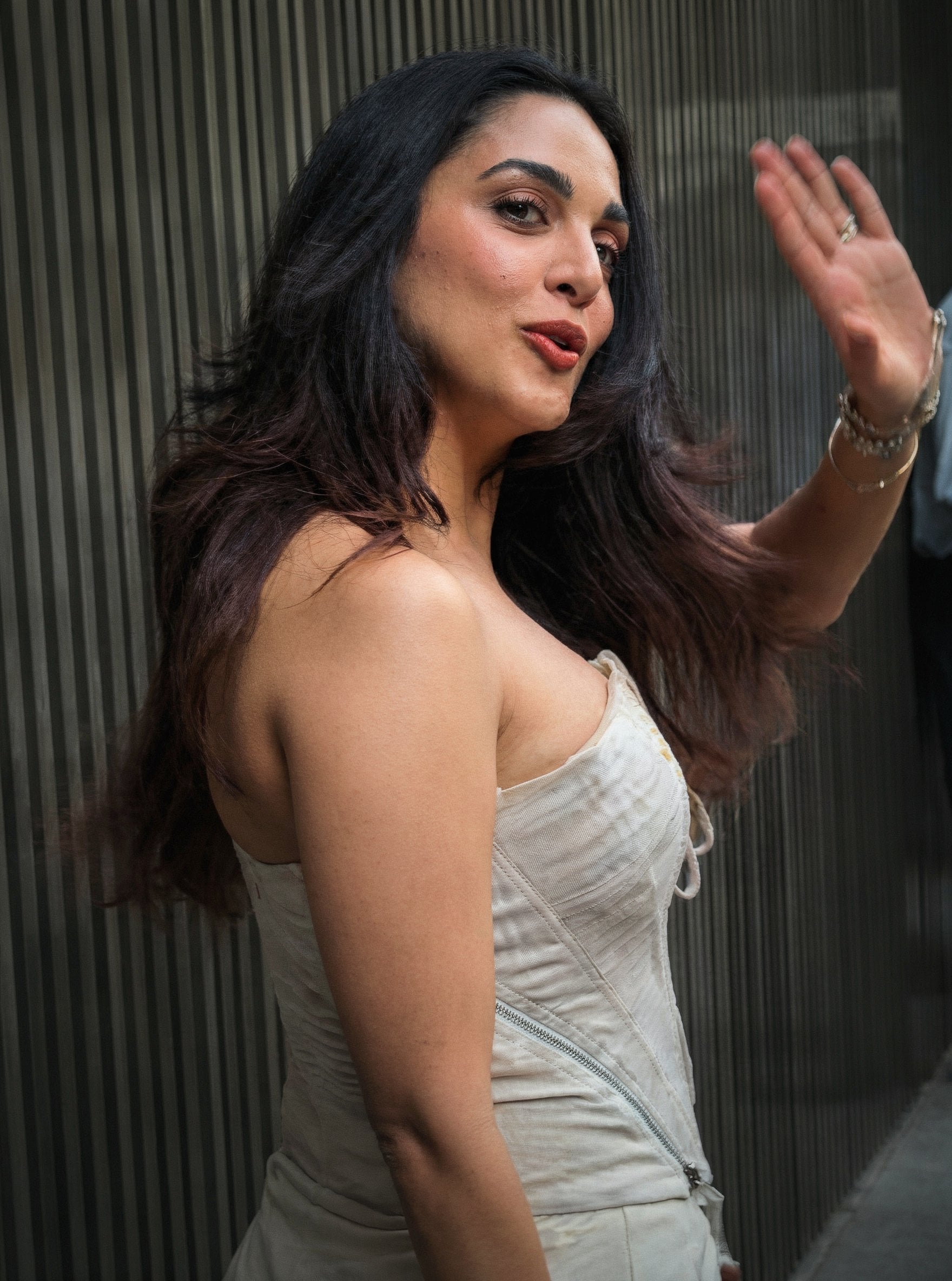 fashion fire in these snaps, rocking a beige ensemble that's equal parts elegant and electrifying. In the first image, she's captured mid-wave, her strapless corset top cinching her waist like a dream, with delicate drawstring details adding a flirty, boho vibe.
