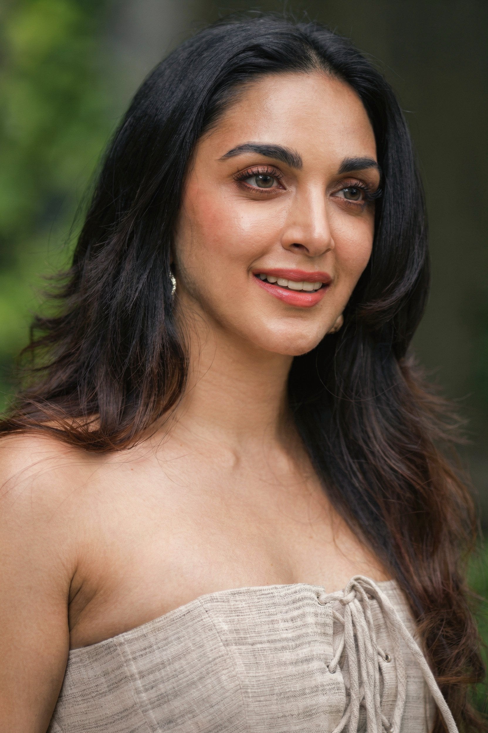 gold jewelry, it's a masterclass in monochromatic magic—neutral tones that pop against her glowing skin and cascading dark waves.