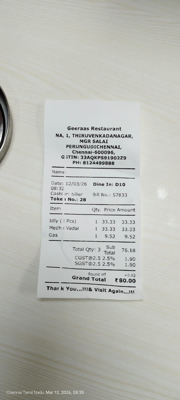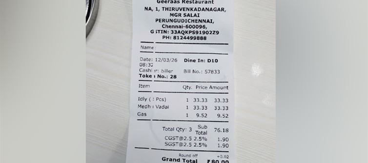 Sometimes, the most ordinary things reveal the biggest problems. A simple breakfast bill from Geeraas Restaurant is now doing exactly that. At first glance, the receipt looks like any other: idli, medhu vadai, taxes, and a modest total. But tucked between the food items is something unusual — a separate line charging ₹9.52 for “Gas.”