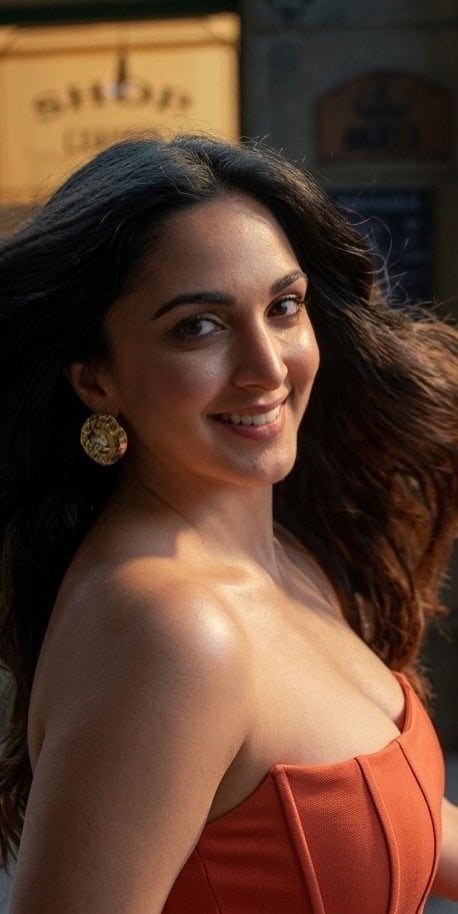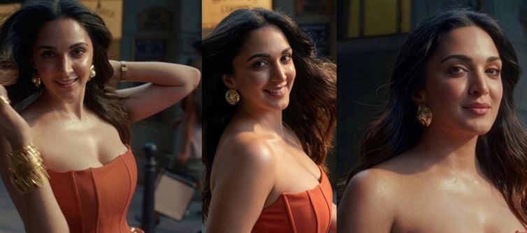 These shots of kiara advani are straight-up lethal. She steps out in a burnt-orange, strapless corset gown that hugs every curve like it was custom-molded to her body. The structured bodice cinches her waist to impossible levels, while the ruched detailing adds that perfect dramatic flair without trying too hard. The fabric catches the golden sunlight like it’s paid to sparkle—dewy skin, sun-kissed collarbones, and that signature Advani glow turned up to eleven. Her long, glossy waves cascade over one shoulder, framing those killer cheekbones and that effortless, come-hither smile. The jewellery? Chunky