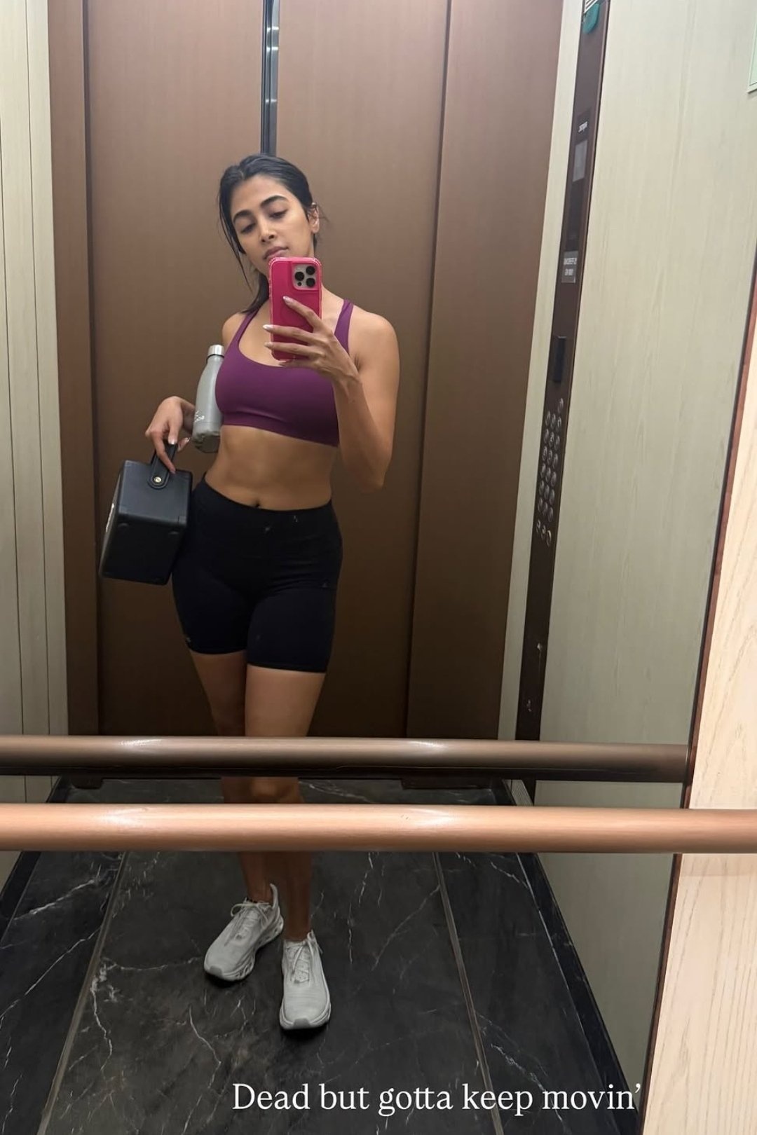 sports bra that clings to her perfectly sculpted abs and perky chest, paired with skin-tight black biker shorts hugging her toned thighs and peach, the actress serves pure heat even when she’s “dead” from an insane workout.