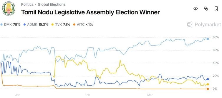 Right now, the market is projecting a strong edge: DMK at 78%, AIADMK at 15%, and TVK trailing at 7%. These aren’t just opinions—they’re weighted by financial risk.