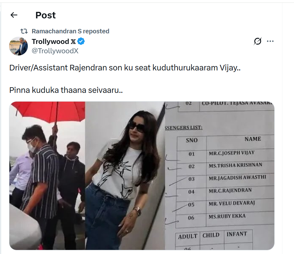 Yes, that includes the trisha trips. The private flights, the closed-door getaways, the “just good friends” stories that never quite added up. rajendran wasn’t parked outside. He was in the room, holding the keys to secrets that could torch Vijay’s flawless superstar image in a heartbeat. When someone knows where all the bodies are buried, you don’t thank them with a watch. You buy their silence with power. You elevate the family. You create a debt so ironclad it guarantees the lips stay sealed forever. This wasn’t generosity – it was survival politics at its rawest.