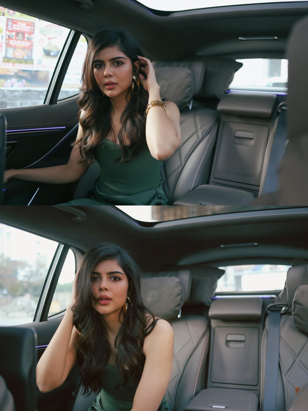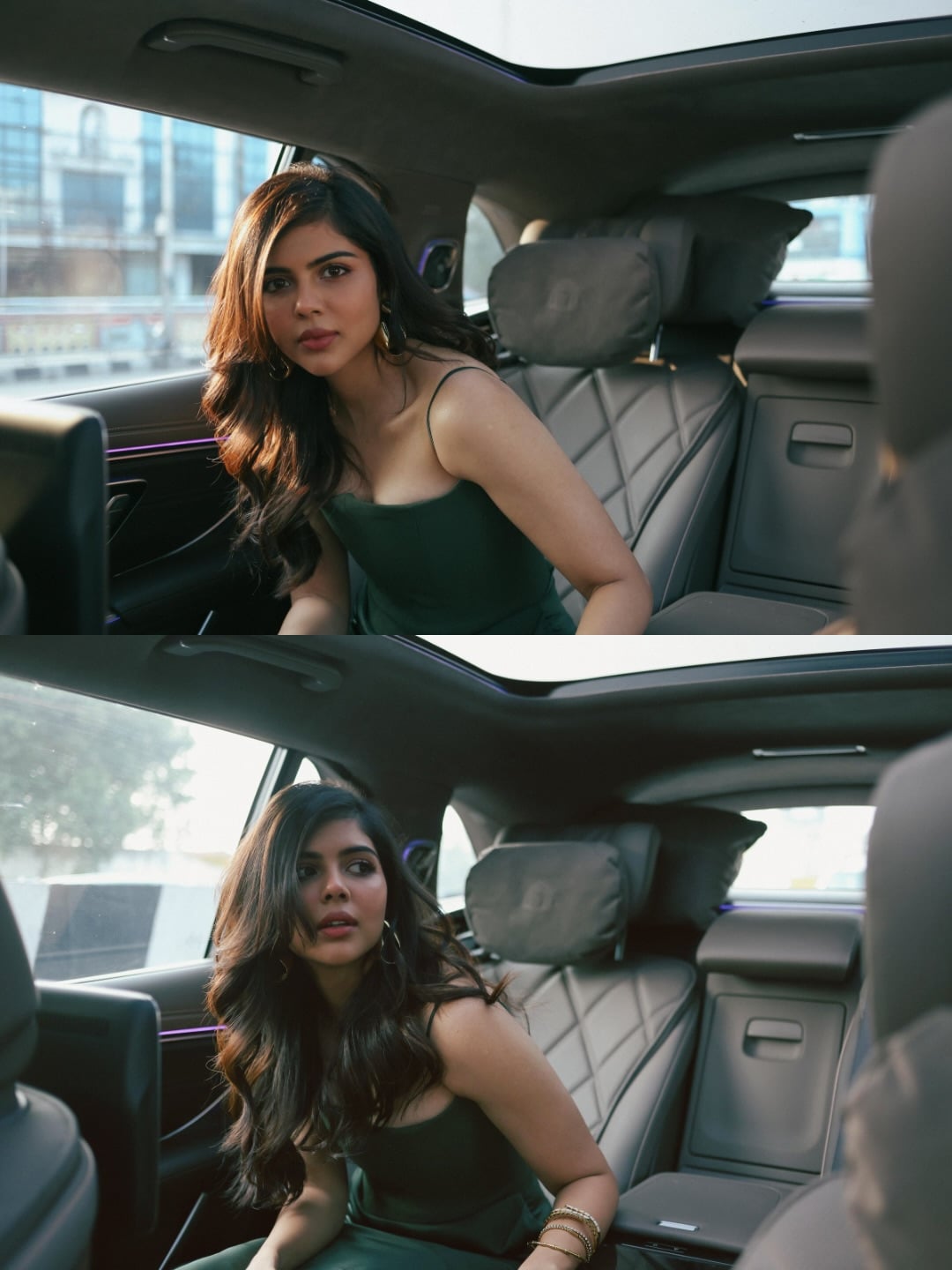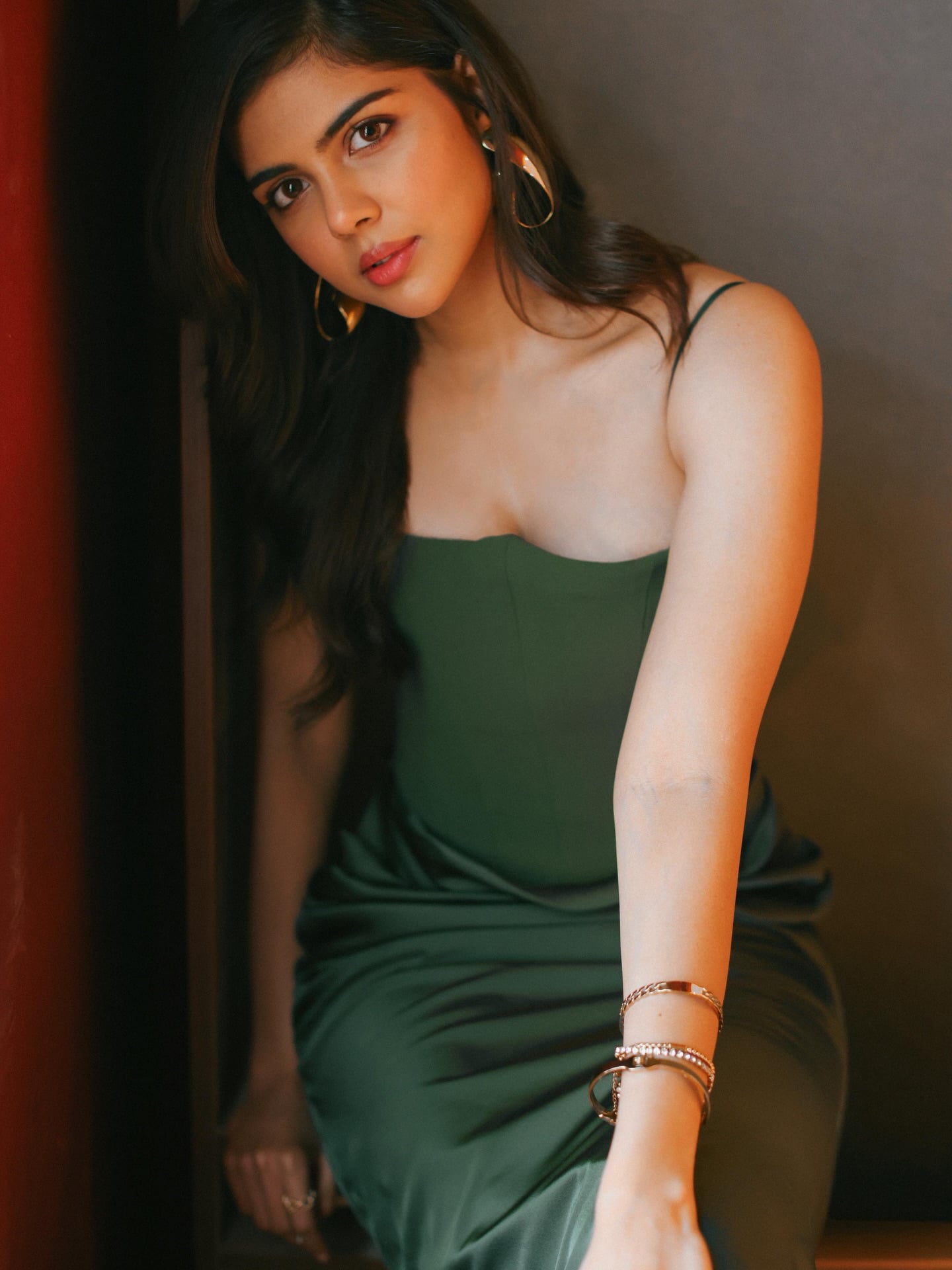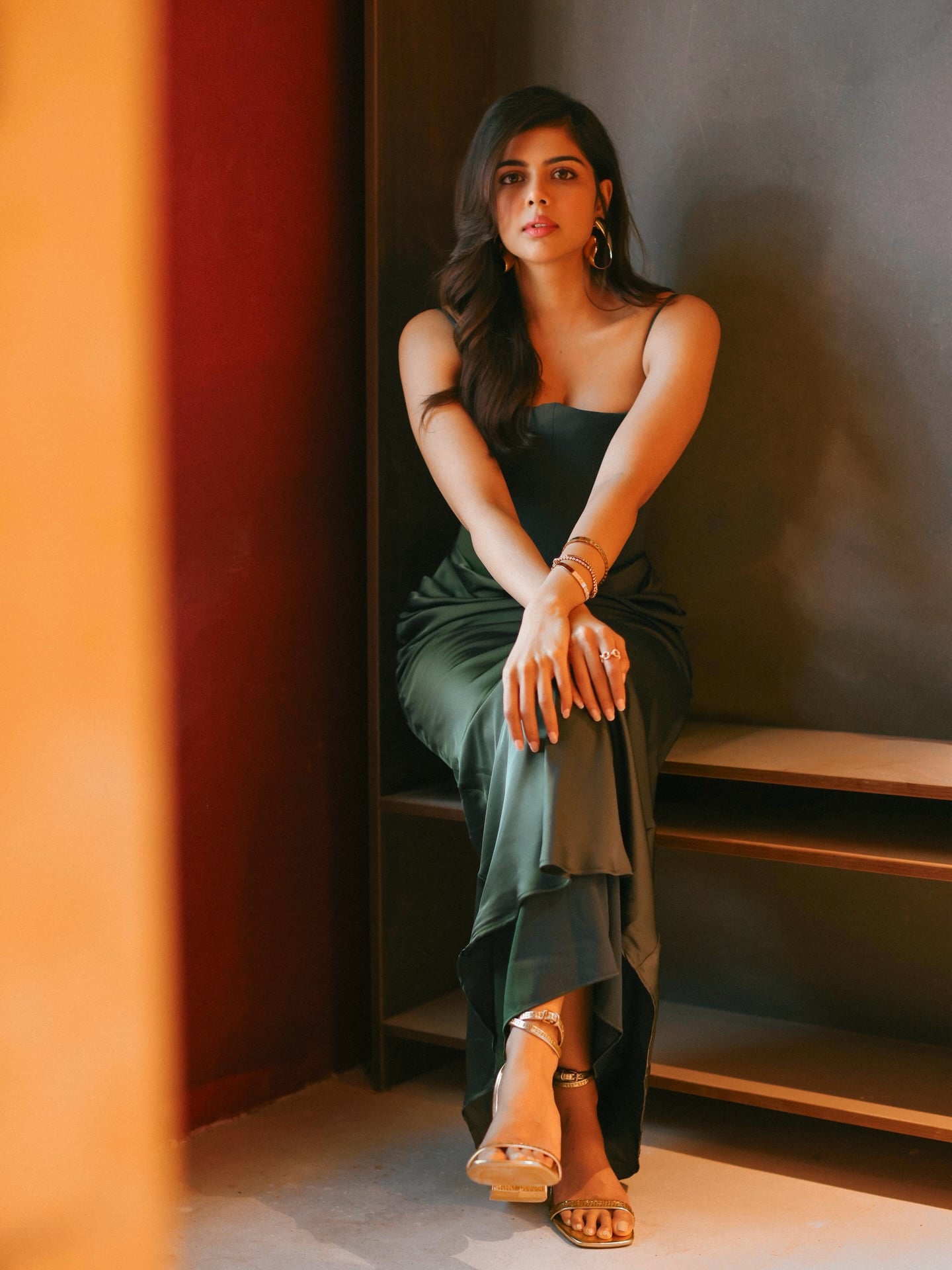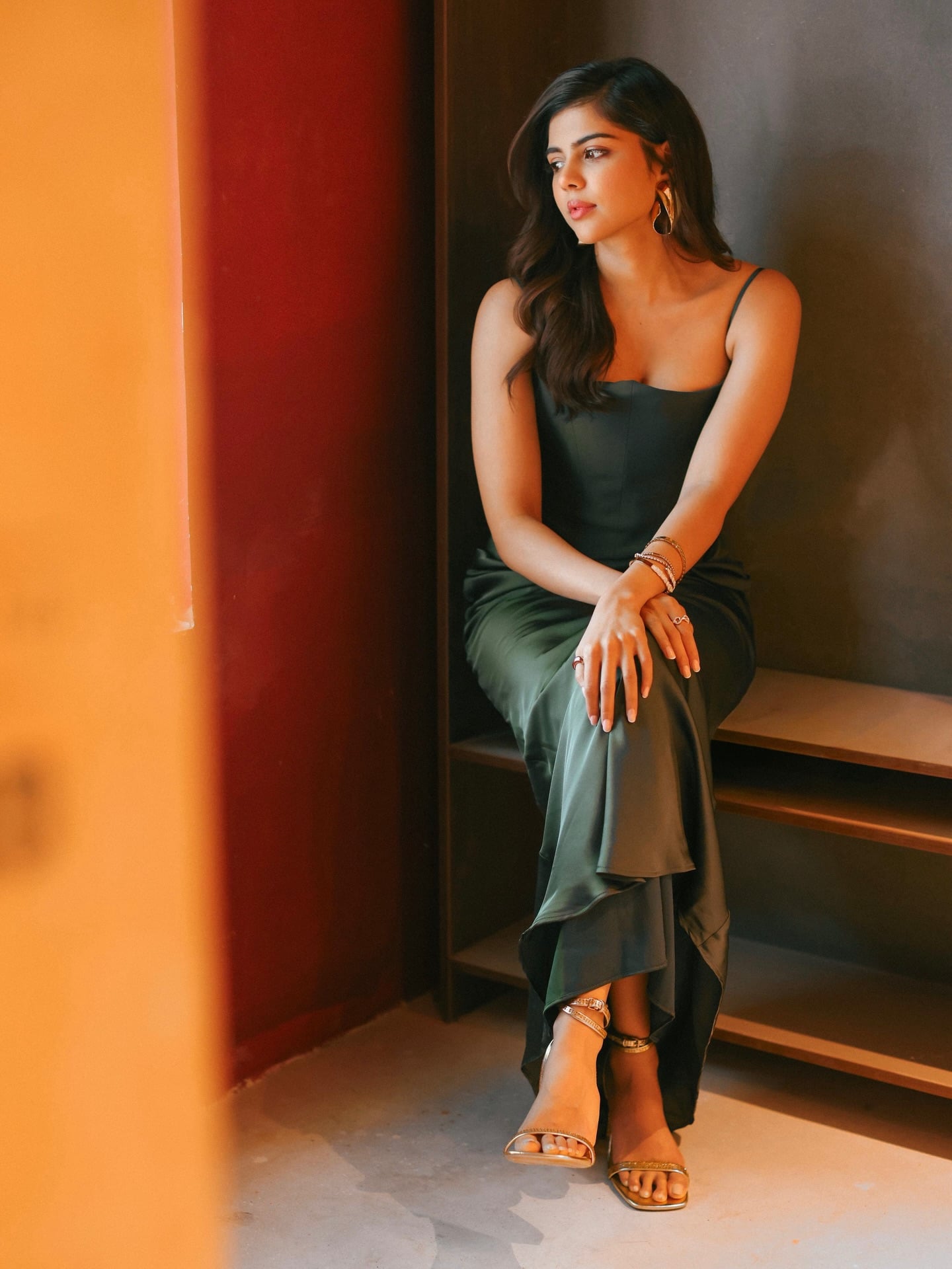 priyadarshan serves absolute elegance in a figure-hugging olive-green satin slip dress that’s equal parts old-Hollywood glamour and modern minimalism. The spaghetti-strap silhouette skims her curves with liquid-like fluidity, while the draped, ruched skirt