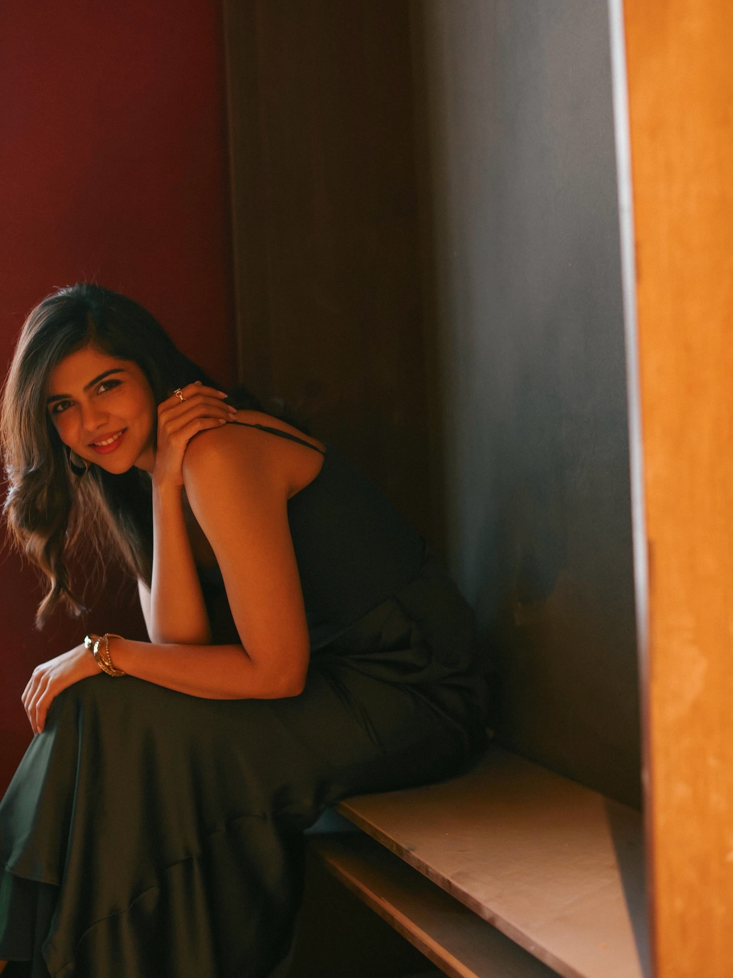 adds texture and movement without a single extra embellishment. The rich, earthy tone flatters her warm complexion beautifully, creating a luminous, expensive-looking glow under soft lighting.