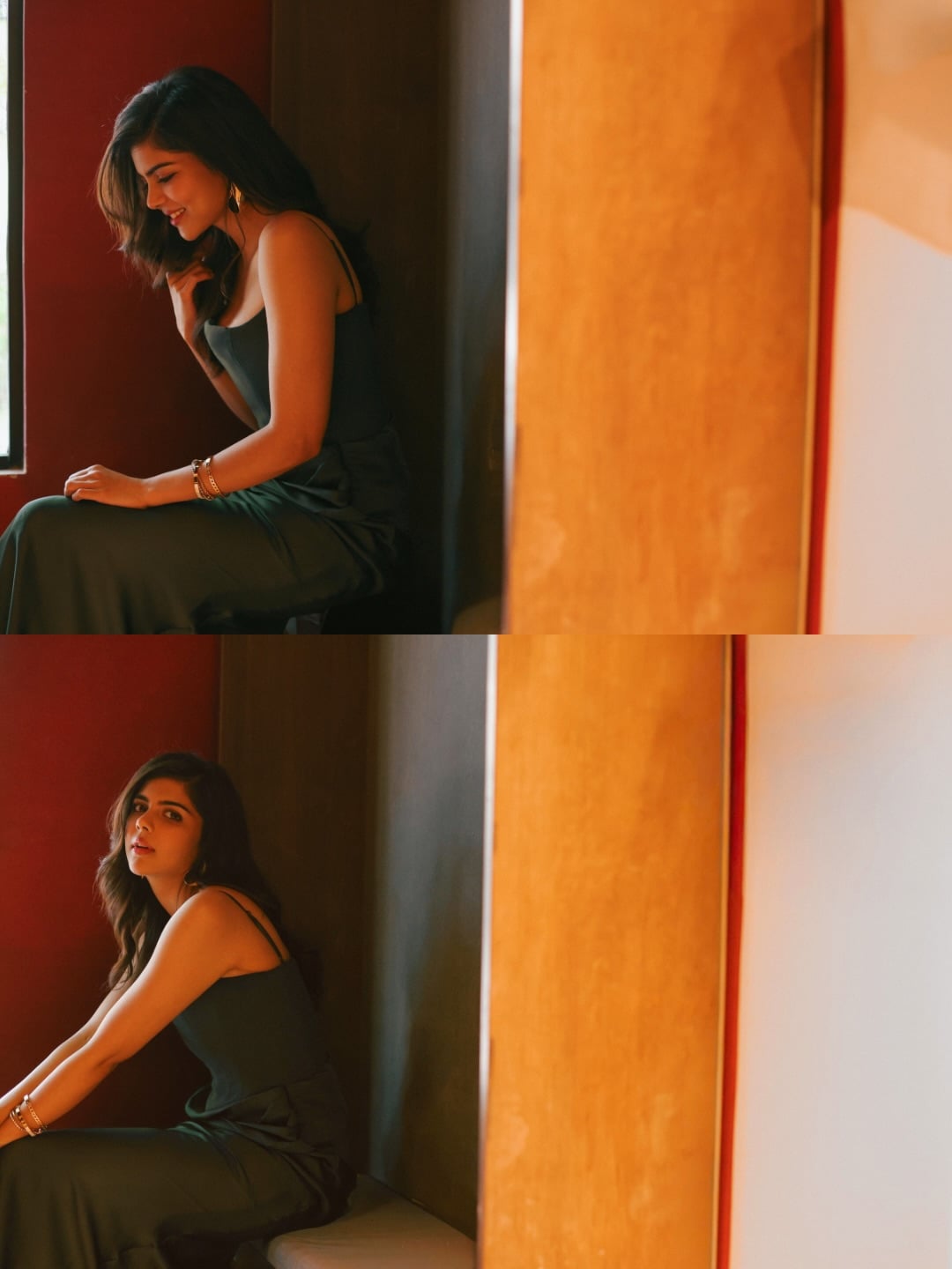 raw intensity and confidence; the seated shots highlight the dress’s graceful drape and leg-baring drama; the tiled-wall moment